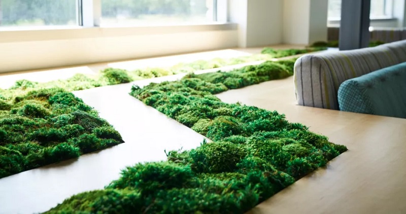 例如铺设在休闲区蜿蜒的绿植覆盖条,蓝色与黄色搭配的大型沙发,这些都给空间带来意想不到的视觉效果。