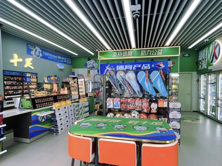 该店位于黄龙体育中心W109-2号,主要以绿城的绿为主色调,步入店内,可爱的乐小星化身足球小将在绿茵场上迎接每一位顾客。与普通的十足便利店不同,店内开辟了体育用品专区,羽毛球、乒乓球、足球、篮球等运动装备触手可及,满足市民的即时运动需求。