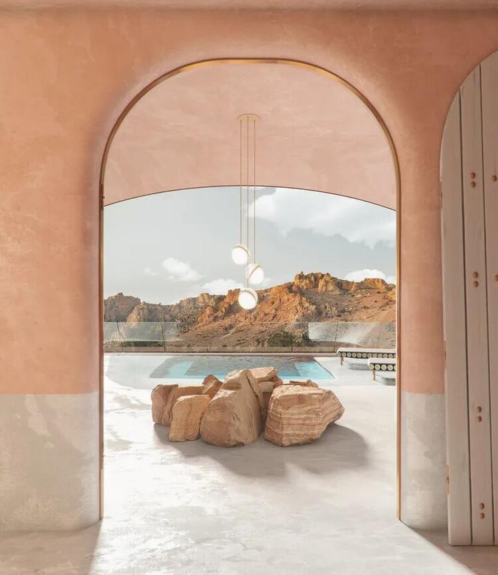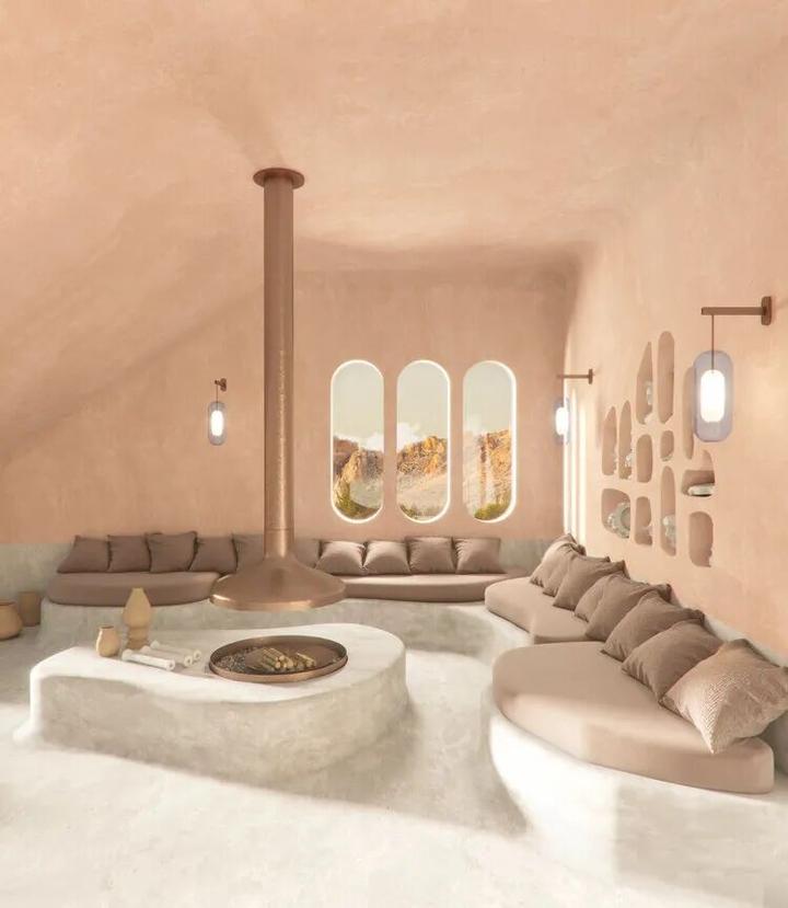岩石和石头原始本质的属性使其成为众多饰面材料中具有最高触感的物体,将自然、粗糙的材料作为空间的主体,浪漫的石器时代的美学演变强调人与自然的关系,以洞穴的形式布局久远而神秘的语境带着来客进入一个全新的体验。