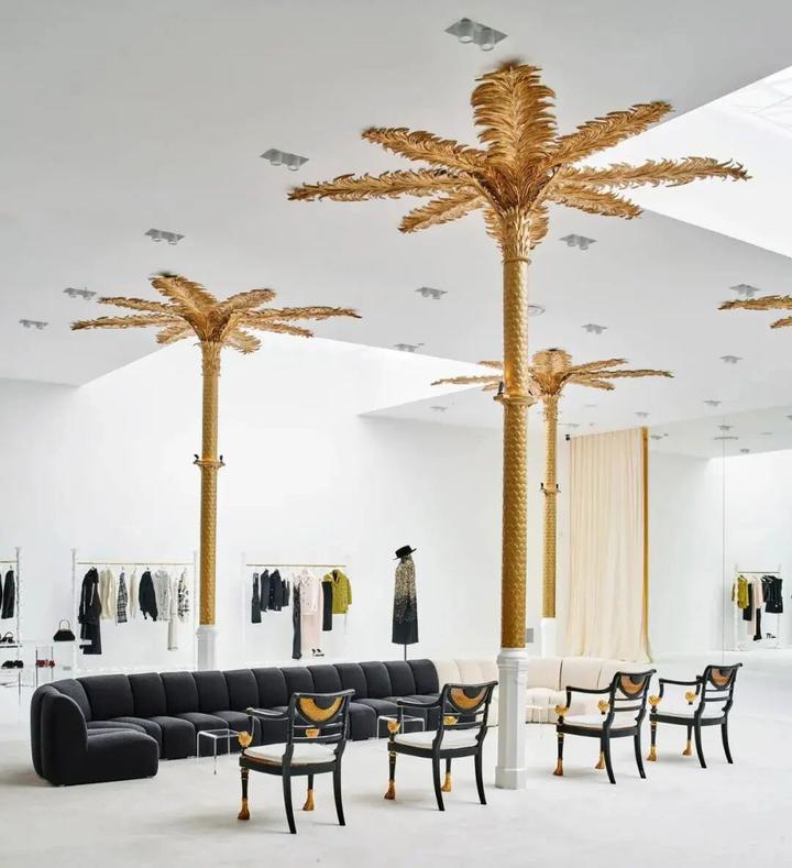 金漆闪耀的棕榈树生长在空间,高高的天花板,明亮的白色墙壁,所有元素展现出宫殿般的高贵华丽感,象牙色地毯和大理石瓷砖与黑色的家具形成对比。