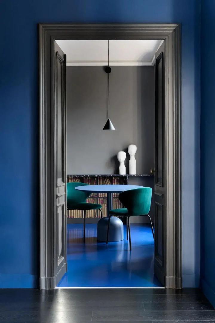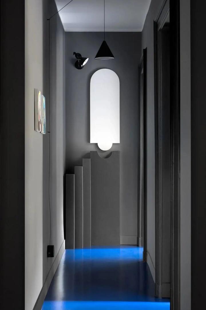醒目、充满活力的蓝色色蔓延着地板与墙壁,与不同的灰调搭配,在几何艺术形态下创造了一种几乎是静态的、形而上的城市环境。