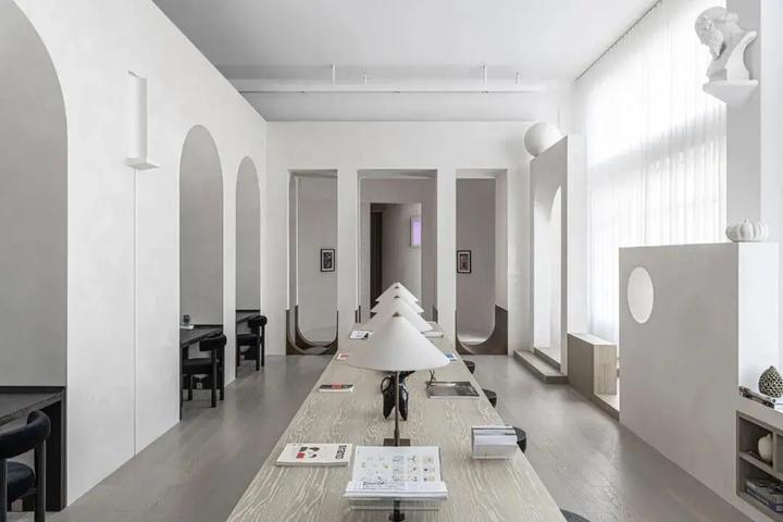办公空间灵感源自意大利文艺复兴画家安托内洛▪德·梅西那的经典画作《St. Jerome in his Study》,布局与空间呼应了画中的拱形元素与人们在穹顶下聊天,光线自由渗透进来的氛围,强调了自然光和几何形状的重要性。