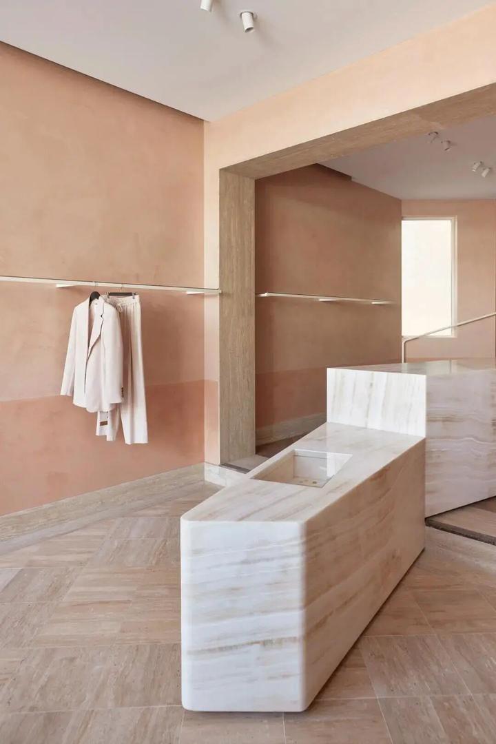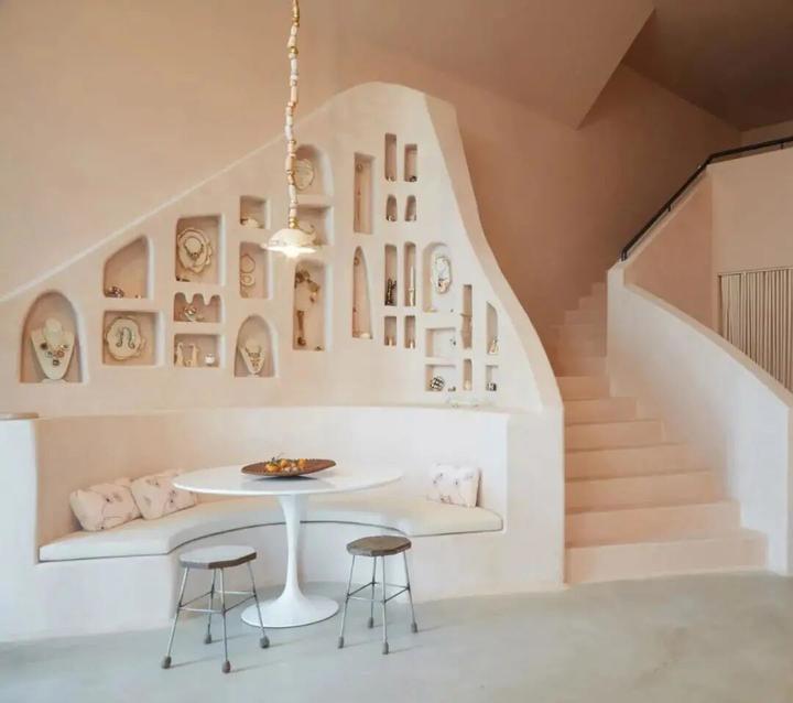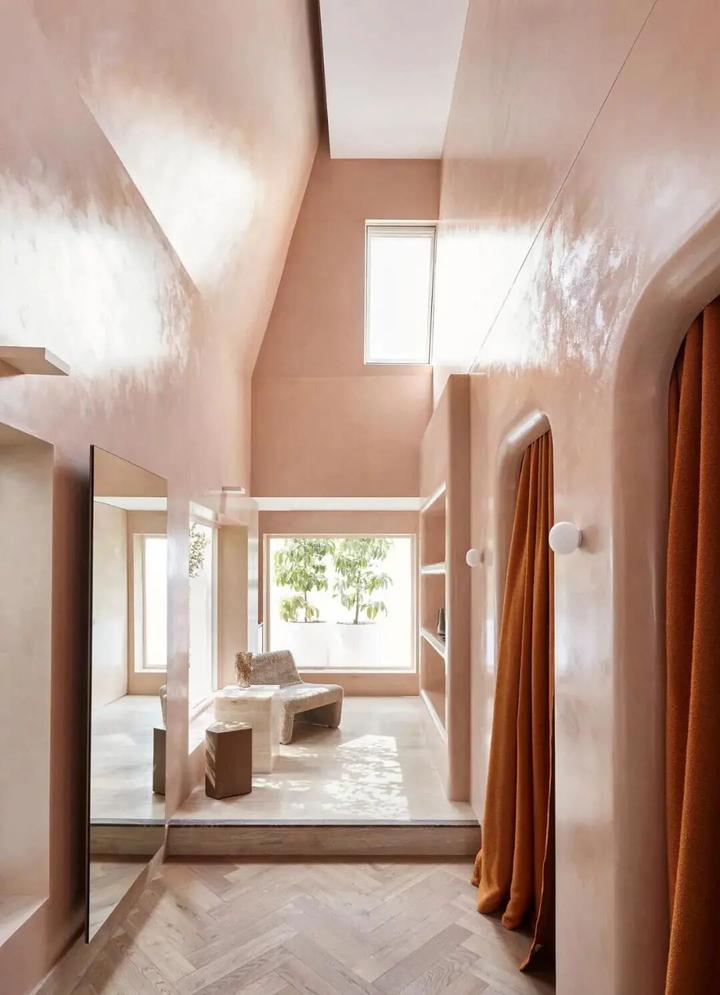 室内四个相连的房间组成,平层地面被层层的台阶和石灰边框线勾勒出层次。橘粉色的色调契合了女性物品的属性与气质。
