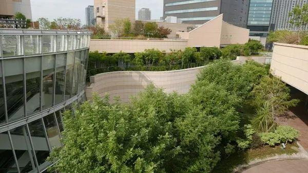 难波公园彰显了一种自然生态的生活方式,空中花园、屋顶绿树,公园直接跟大街相连,为钢筋混凝土林立的城市里带来了一股清新的气息。人们可以欣赏成群的大树、岩石、悬崖、草坪、溪流、瀑布池塘及露台,人们徜徉在空中花园中尽享体验式购物的乐趣。远看该建筑是一个斜坡公园,从街道地平面上升至8层楼的高度,层层推进、绿树茵茵,仿佛是游离于城市之上的自然绿洲,与周围线形建筑的冷酷风格形成强烈对比,成为嘈杂背景下的一处生动、温馨的街景。