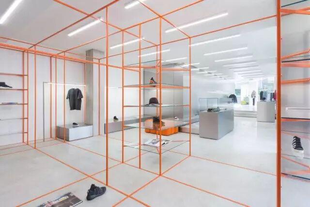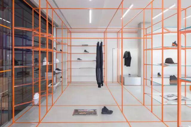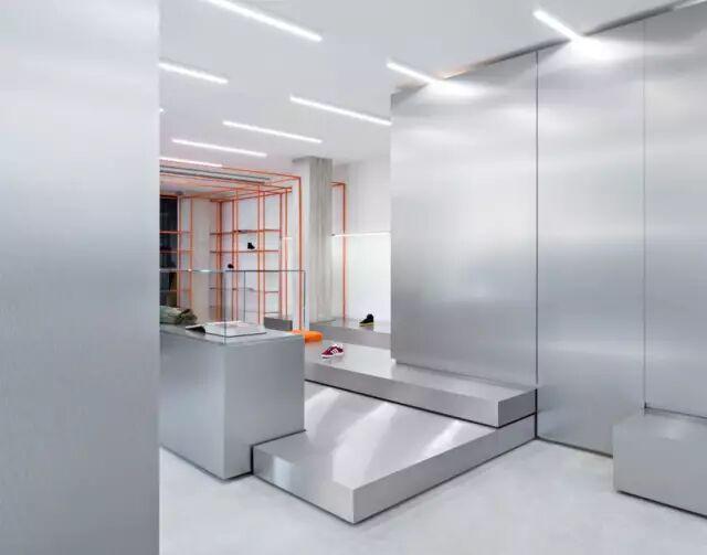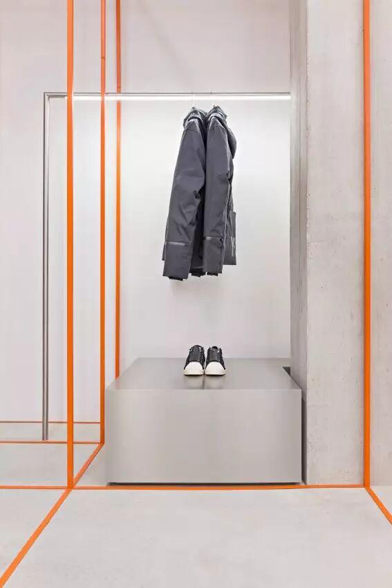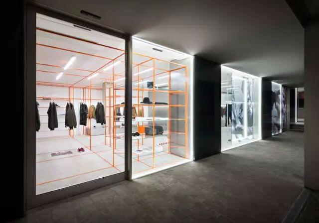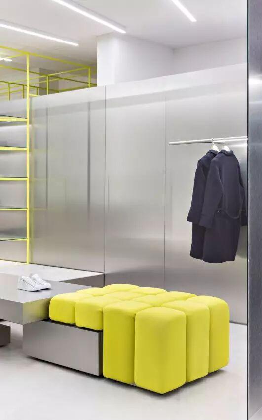 Acquasalata服装店位于意大利北部的一个小城镇,其室内空间由Storage团队设计。设计师通过使用彩色网格和带状照明,巧妙的将分散的面板材料结合了起来。其卷有大有小,用拉丝不锈钢制成,格栅采用黄色和橙色两种主色调。连续的条纹灯产生的动态节奏感与极简主义的空间形成对比。
