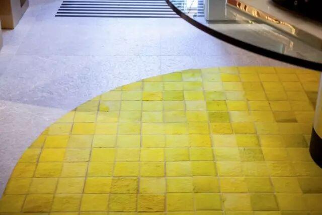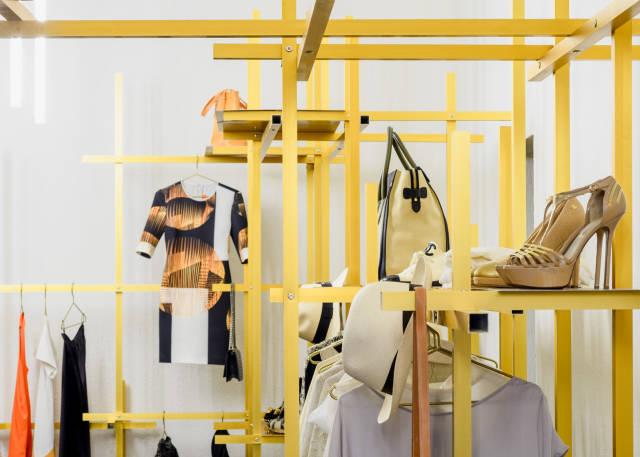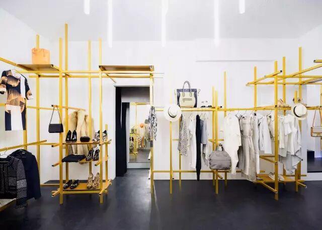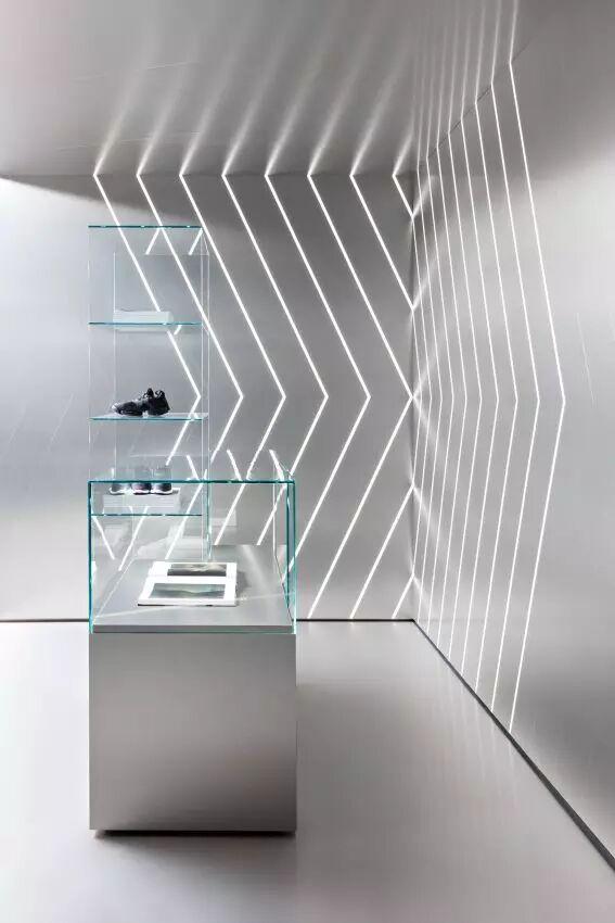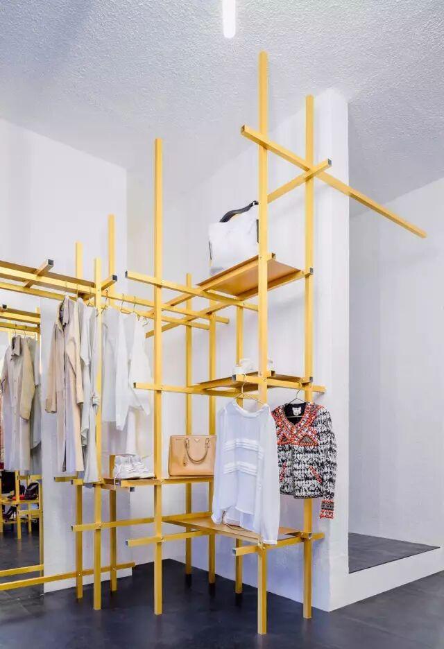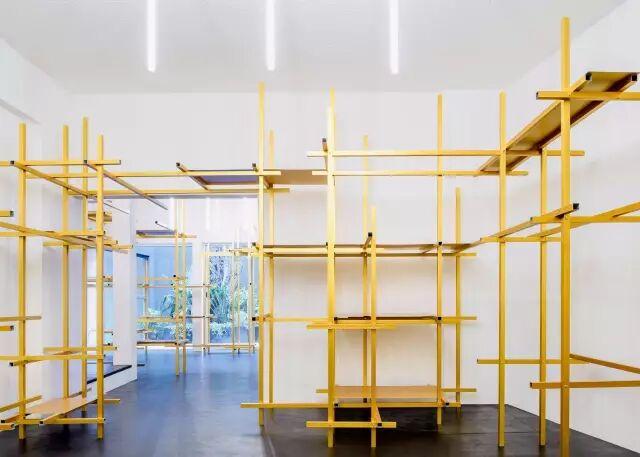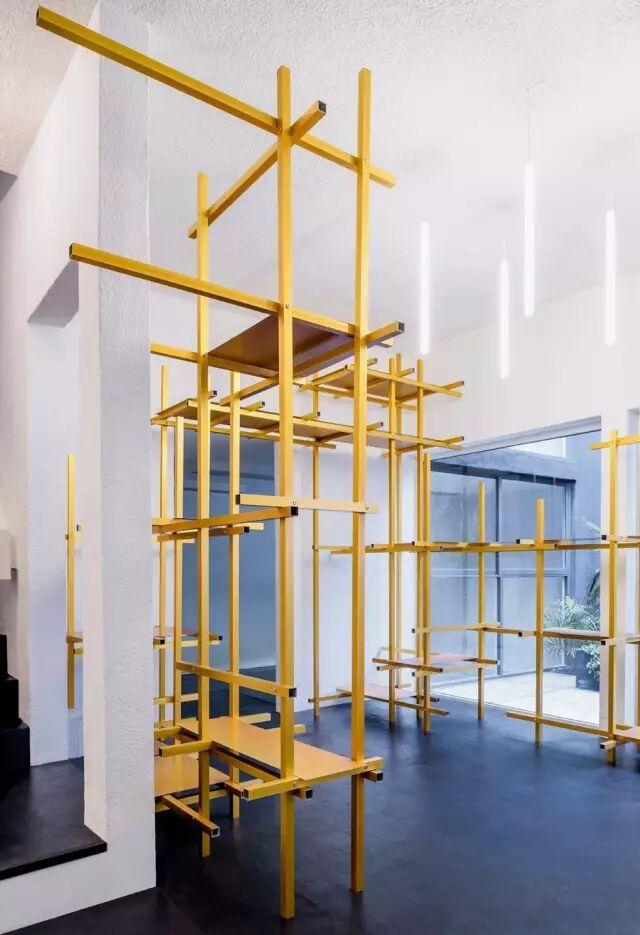 展厅的黄色金属框架由垂直和水平的铝杆组合而成,它们可以用作轨道,金属板可以根据商品的不断变换需要在独立网格上移动。选择铝这种材料是因为它符合有限的预算并且安装速度快。展厅地面铺设黑色的橡胶地板,垂直的灯条分组点亮。