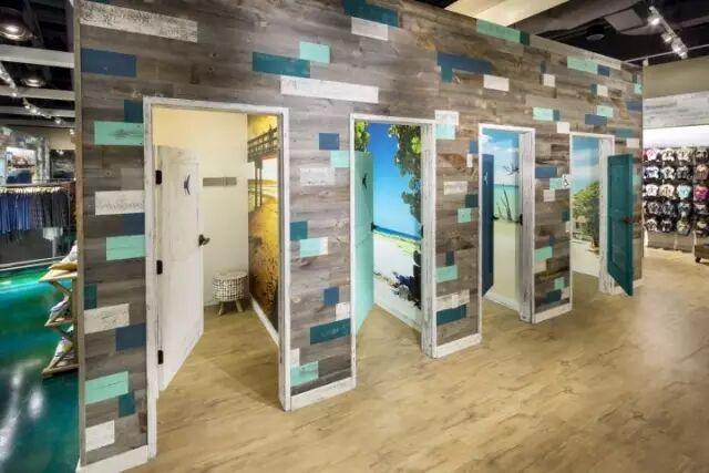 深水树脂混凝土地板代表着“沙洲”;休息等候区的家具聚集在一起,就像客户沿着海岸线聚集的篝火;周围被粉刷的多彩多姿的墙壁和木板,像是在海滩上发现的被风化了的珍宝;此外,还有一间由当地冲浪者Juan Rodriguez设计并制造的定制冲浪板的装饰空间。店铺里有四个试衣间,每一间都有来自佛罗里达海岸周围的熟悉的环境图像。这些超大的图像为客户试用服装,同时为分享社交照片提供了背景。相邻的插板还为客户提供灵感,包括从白天到晚上的精选系列。