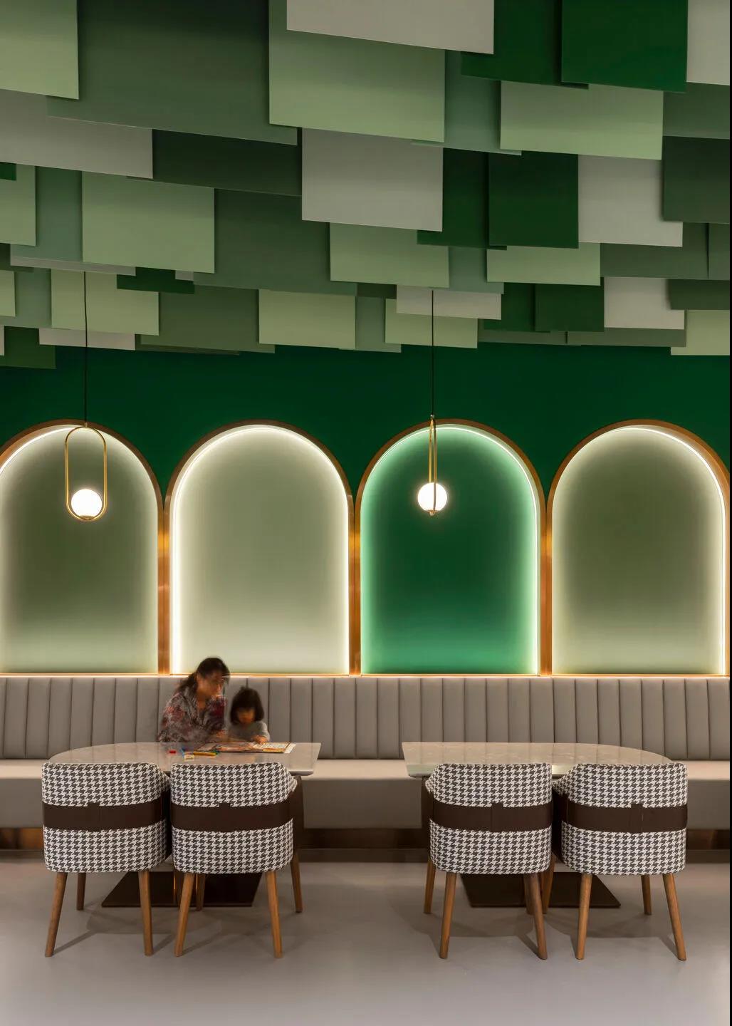 第三个区域是一个绿色的家庭餐厅,由三个不同的功能区组成:一个围绕椭圆形剧院的平台用餐区,一个开放式厨房对面的长椅休息区,以及一个由激光切割的白色金属板构成的描绘花园住宅形状的VIP区。沉浸在树状光影效果下,可以举办不同的活动,包括儿童生日聚会和研讨会。家长也可以在孩子上课和分享育儿乐趣的时候享受一顿轻松的午餐或下午茶。