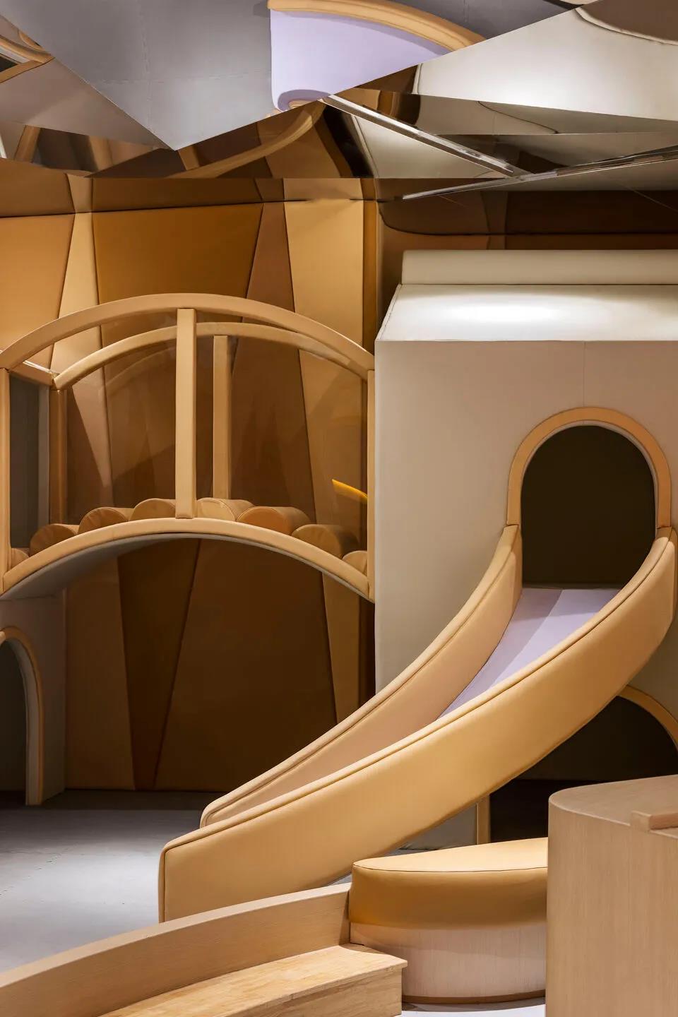 第四个区域是棕色调的游戏区,孩子们可以结交新朋友,在一个万花筒般的世界里玩耍。多面镜面不锈钢天花板为空间创造了视觉上的错觉和兴奋感。
