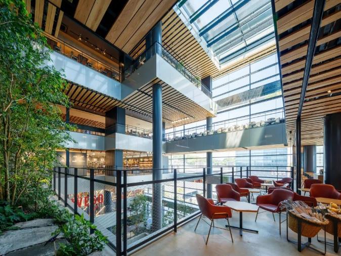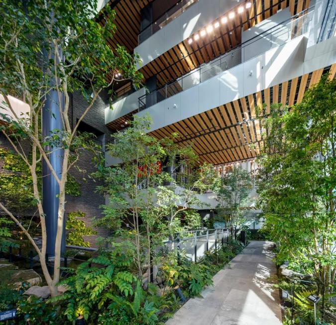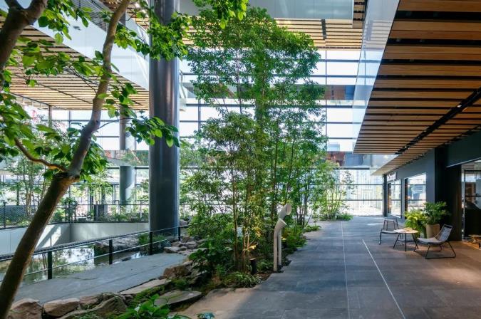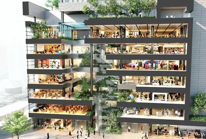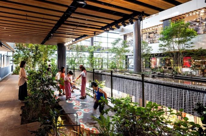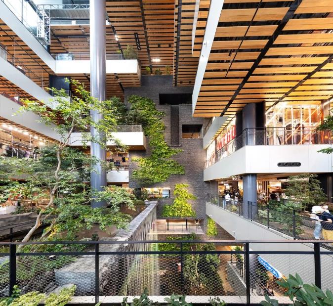 引入绿色元素,商场自然化环境持续升级。JR熊本大楼最标志性的设计,是在跨越1-7楼的中庭空间打造了一个超高挑空的立体庭院“Boken no Mori”。人在其间,感受阳光温柔,落瀑灵动,茂林修竹,大自然的生态原貌就在眼前。