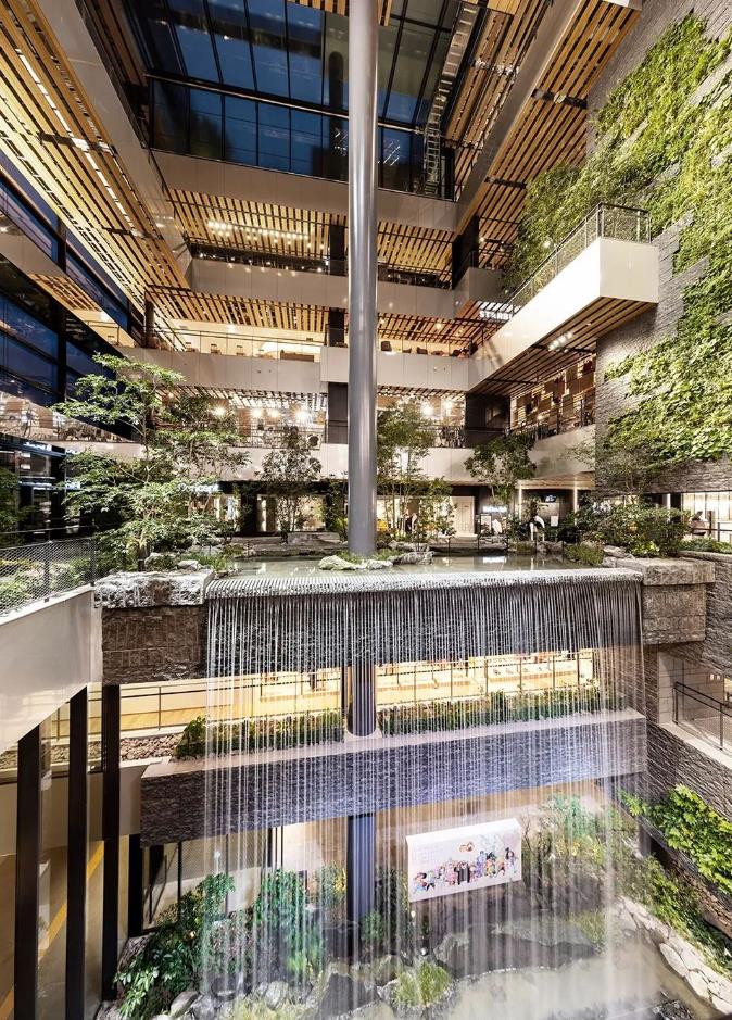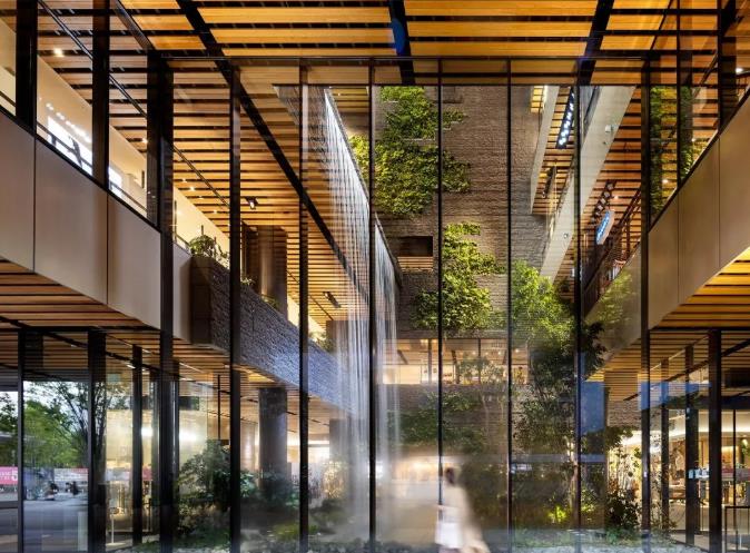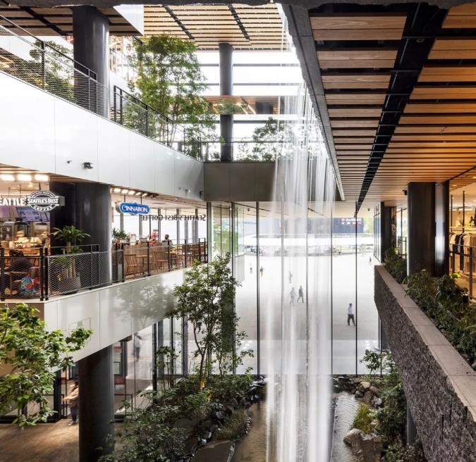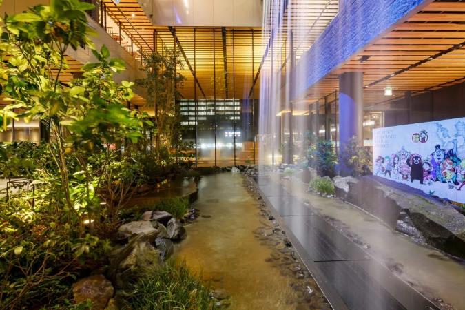 图片庭院内种满了绿植,各层之间设有 3个瀑布,瀑布水流源于9层酒店中庭的水盘,落差最大10m,从3层倾泻至地面层的瀑布高宽均为10m。瀑布以熊本县的小国町的“锅之瀑布”为设计原型,引白川水源而建,传递大地与水的浑厚力量,飞流而下的瀑布水景与层叠的绿植相映,构成了一个绿色立体化的公共空间。给游客展示的是一幅“居有水则灵 城有山则秀”的熊本山水画卷,清幽中透出自然的雄美。