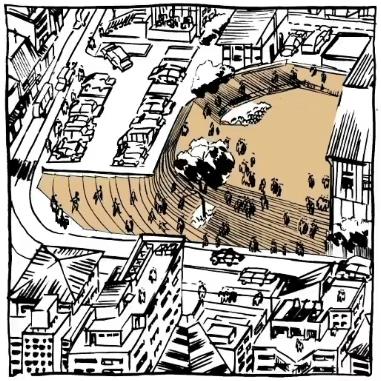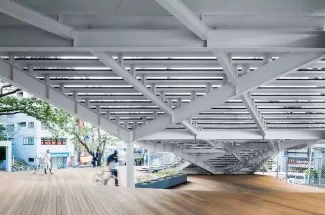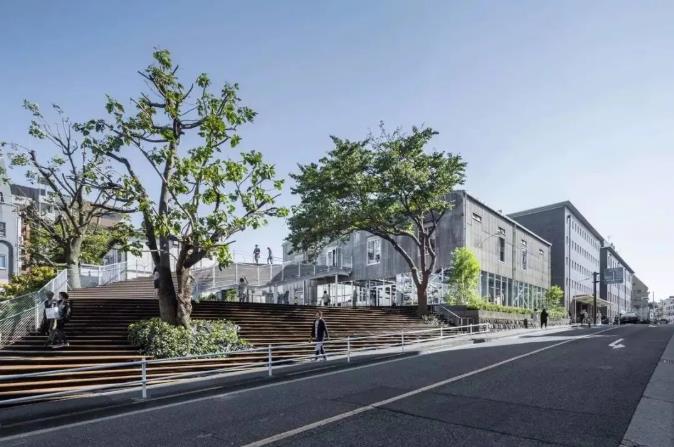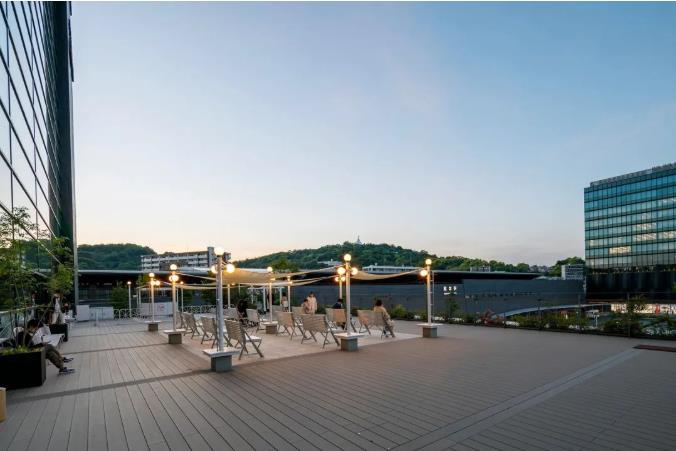 大台阶从项目直通而上,贯穿整个项目,指引人们一路向上,直到建筑的另一面的公园区域,木制阶梯也同样被赋予了功能,每一层都有可供坐着甚至躺着的平台,辅以绿植点缀,成为了人群休憩交流聚餐的场所。