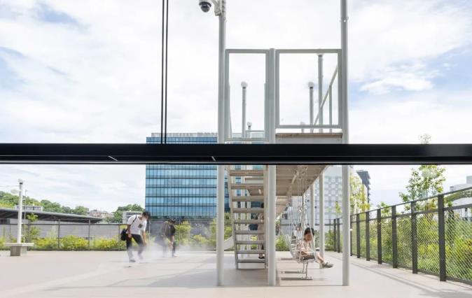 从建筑主体的3楼构筑一个大幅伸向广场的大屋顶,在遮挡熊本强烈日照的同时欢迎着游客的到来,其上部是15m×30m的空中广场“屋顶露台”。为了能够让孩子们畅享欢乐时光,这里精心设置了游乐设施以及缓解暑热的喷雾设备和帐篷,还有迷你电车轨道、三轮车、秋千、溜滑梯等各种游乐设施, 宛如一个小型的亲子游乐场。是一个可举办各种活动的趣味空间。