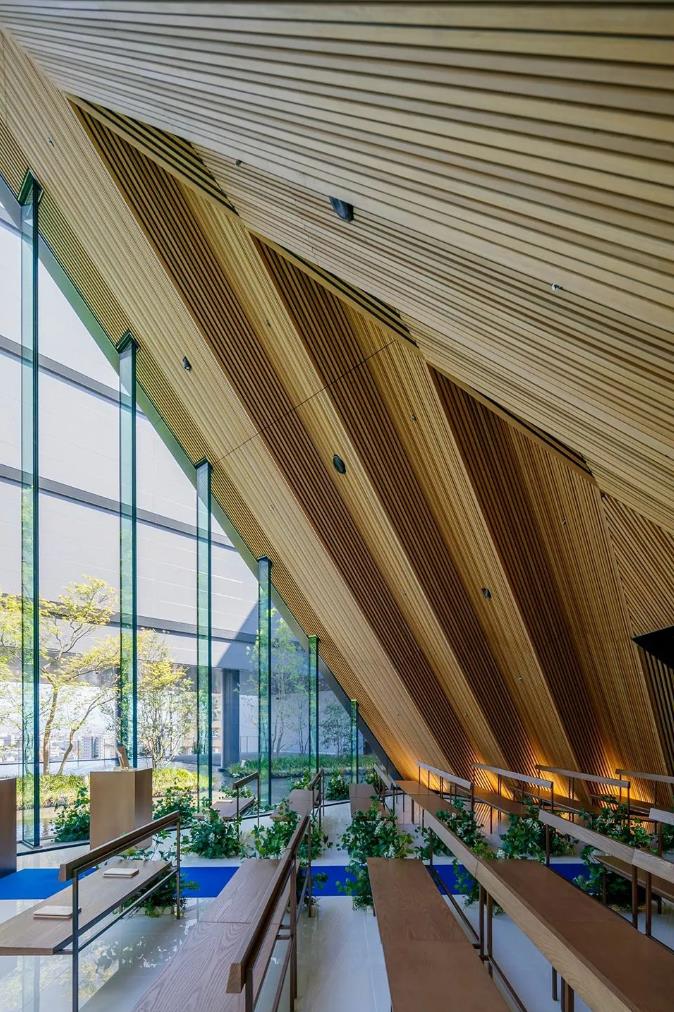 大楼的9楼是面积约1200㎡的屋顶花园,中间是三角形的小婚礼教堂,以现代简约的建筑形式融合周围自然绿色的环境,成为商业体中非常独特而浪漫的存在。可以在里面举办婚礼,从屋顶花园还可以眺望到楼下立体庭院的景色。