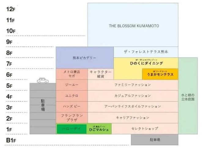 九州致力打造以“宜居、宜业、宜游”的车站为中心的城市建设,熊本车站大楼正是其核心设施。设施内大楼1—8层是由零售商店、餐饮、多厅影院(7层)和婚礼会场(8层)构成的熊本阿姆广场(AMU PLAZA KUMAMOTO),9—12层是九州最高等级的酒店(THE BLOSSOM KUMAMOTO)。