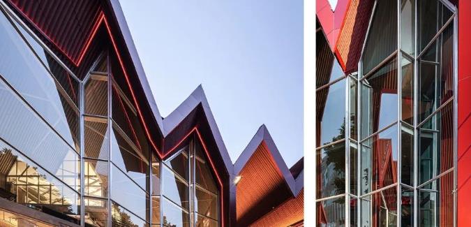 建筑外立面借鉴了8座山墙从而构成了‘M’状的屋顶结构,在满足大空间的需求的同时,唤醒当地人对于过去的记忆。建筑以红色的橡胶板为主材料,兼顾了色彩和隔音上的需求。波纹状的表面与过去的屋顶材料相呼应。透明的红色屋顶板呈现出视觉层次的变幻效果,建筑形式简单大方,这也为此增添了一些新鲜感。
