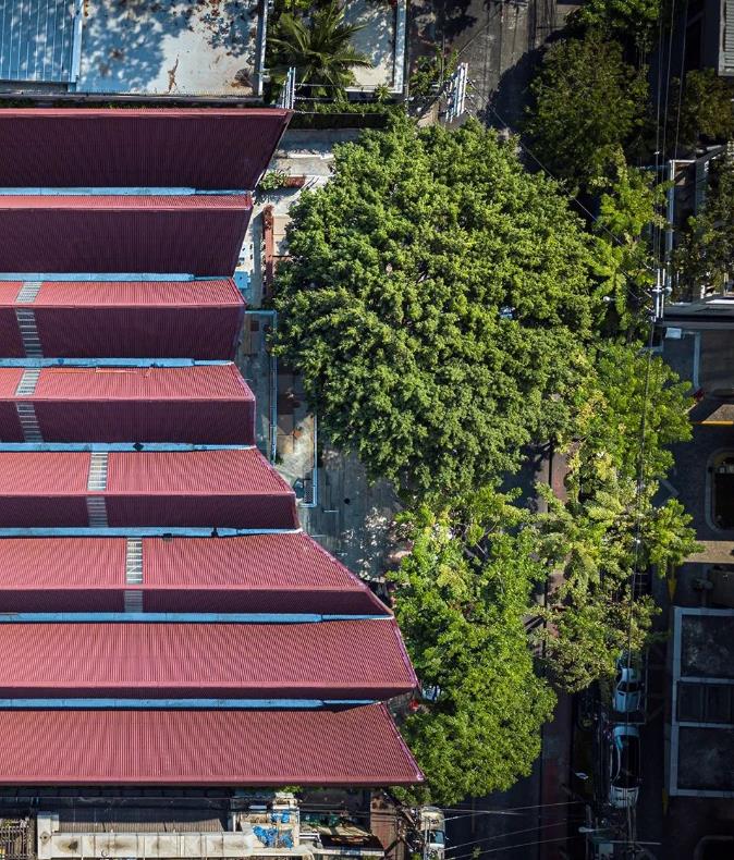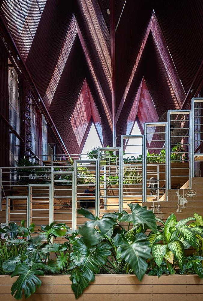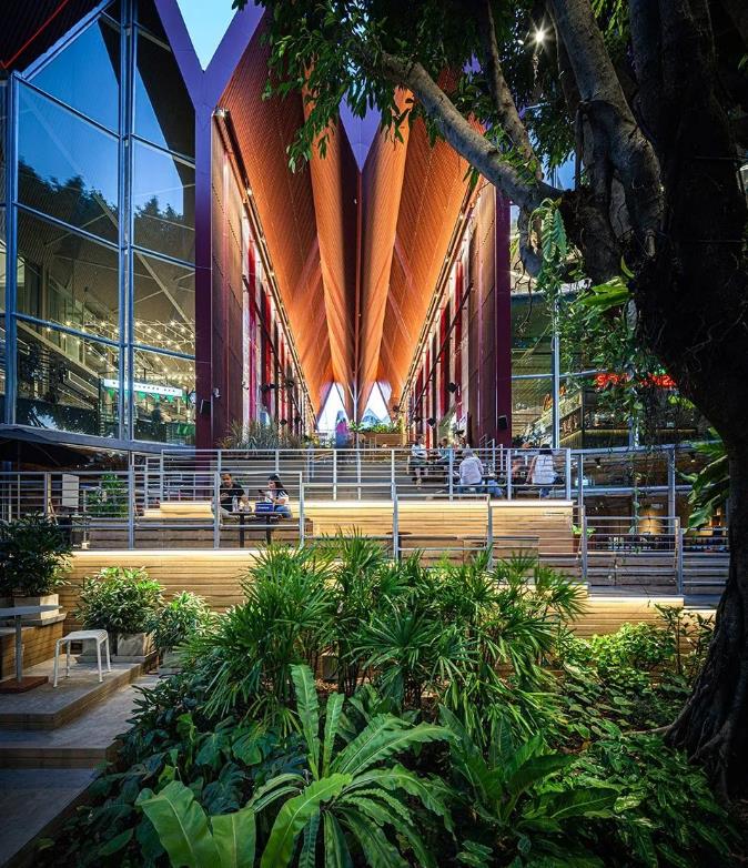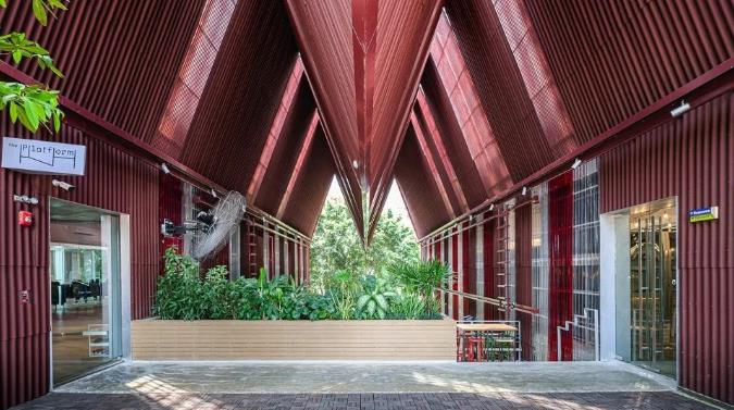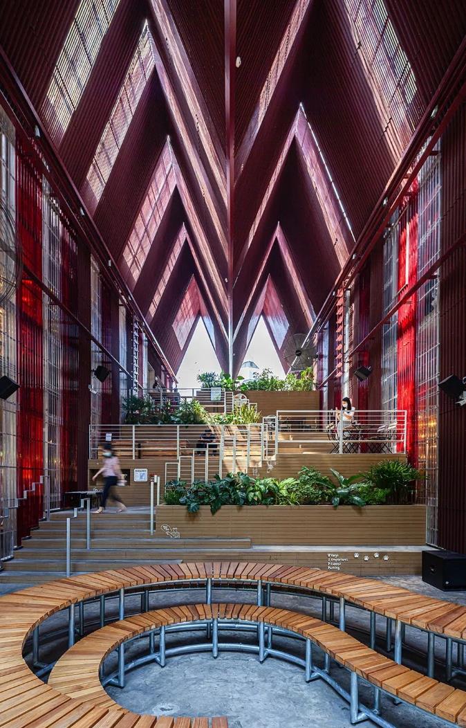另外还有红色大屋顶形成的宽敞、高挑空间,和首馆一样,项目户外空间配合风扇带来空气流动,解决地处热带的高温问题。
