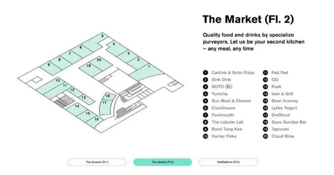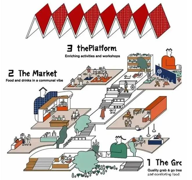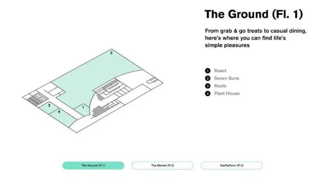 项目设计共三层:一层The Ground、二层The Market以及三层The Platform,基本以餐饮和生活方式为主,力求强化项目的社交属性和社群生活方式。