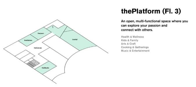 由于场地面积的限制,并不能像其他许多大型商业综合体那样,通过大量独立空间来提供多样化的服务。在此情境下,“The Platform”应运而生,这是一个采用共享经济模式来优化空间规划和创意运营的新型概念空间。不同于按照功能来分割空间的做法,“The Platform”按照时间来分割空间,即让不同的活动在不同的时段中发生。时间的分配与空间的合理设计,为商场提供了更为灵活的空间,诸如烹饪课、主厨餐桌、酒吧、运动、儿童艺术工坊、派对等丰富多彩的活动可以在一天之中有条不紊地进行。