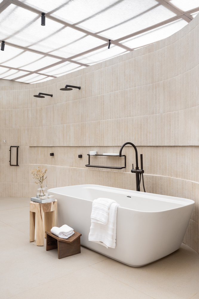 浴室地板和墙壁采用瓷砖,具有矿物化合物的颗粒外观,给人一种非常自然的效果。