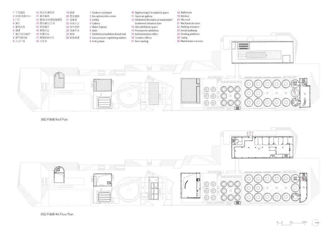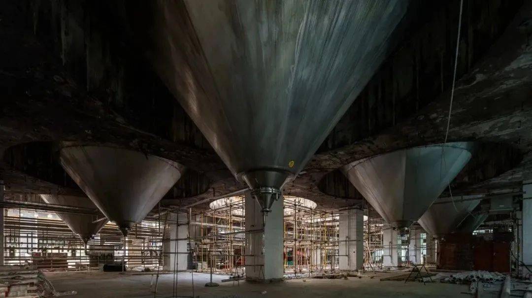 D 栋是最具标志性的工业遗存场景,屋顶矗立 33 个白色筒仓,穿过楼板进入室内现身为巨大的不锈钢倒椎体,悬挂在天花板上,下方是密集有序的管道,我们有选择性地结合展览叙事予以保留或改造。