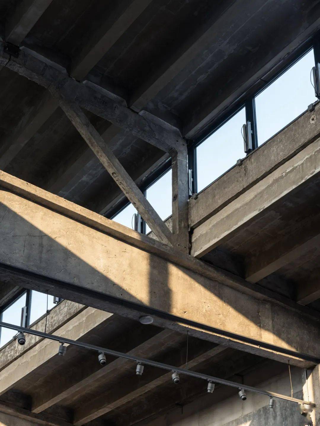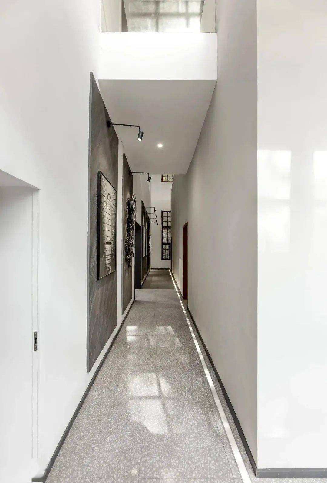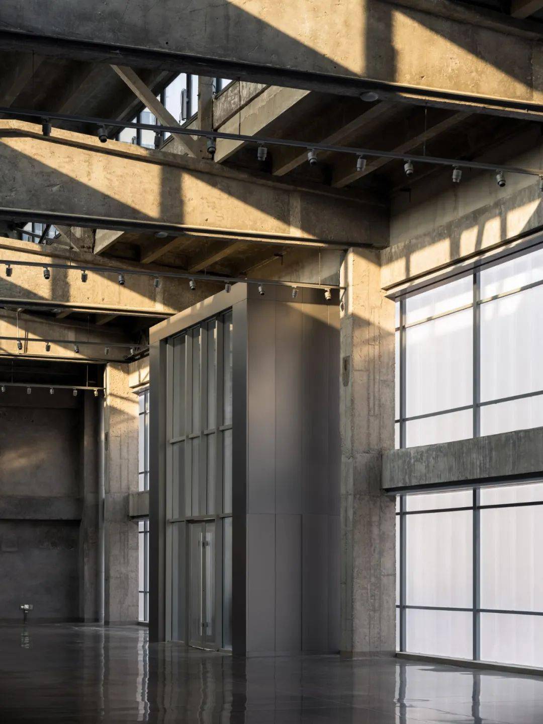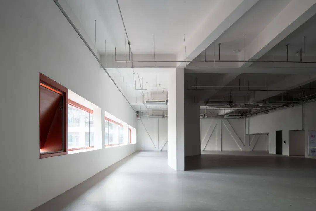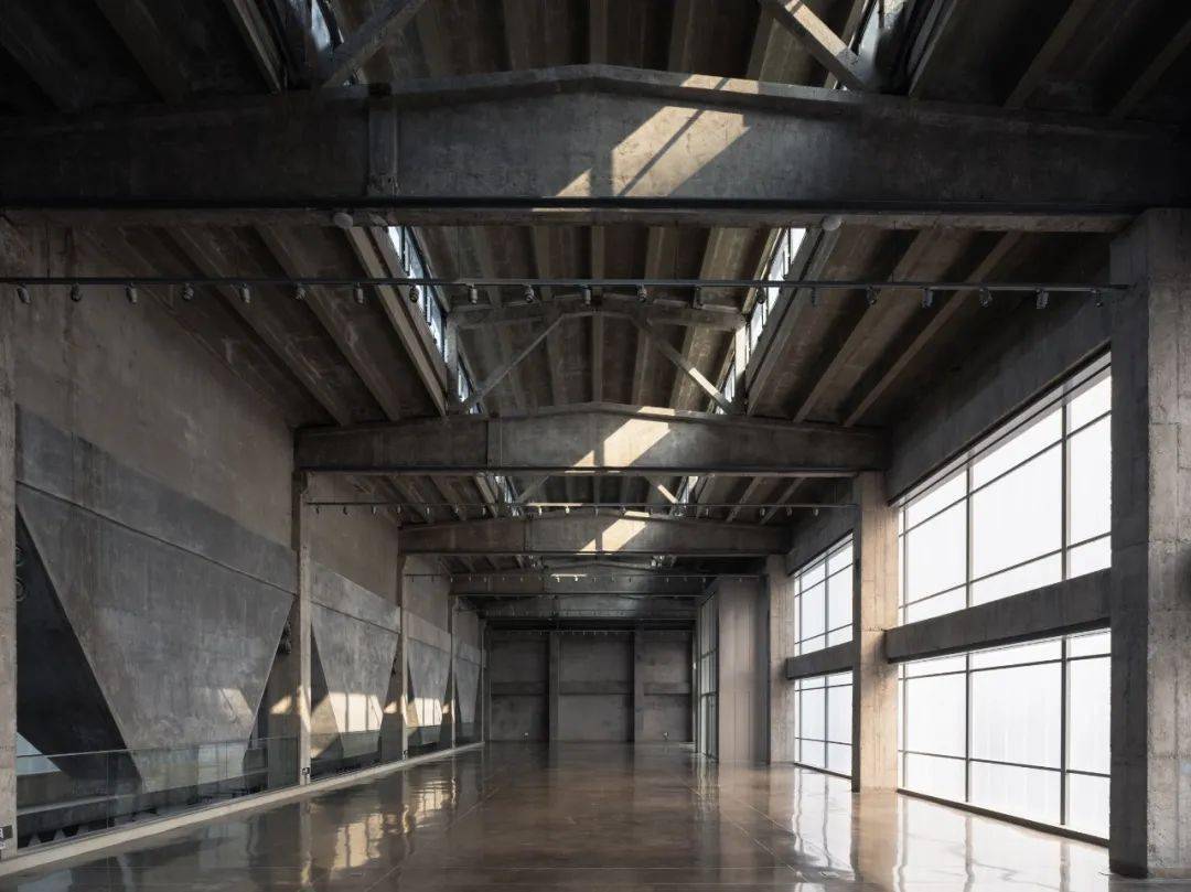 原始建筑的龙门钢架被完整保留,灯光依循纯白的顶面延伸布局,照亮厂房的结构之美。