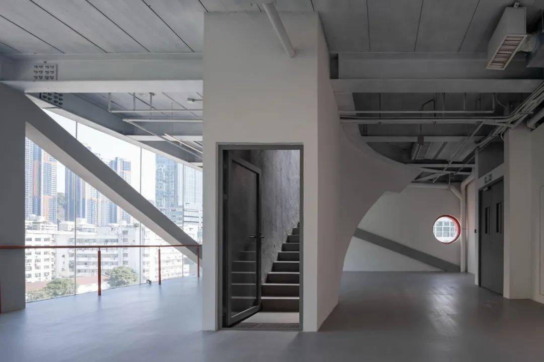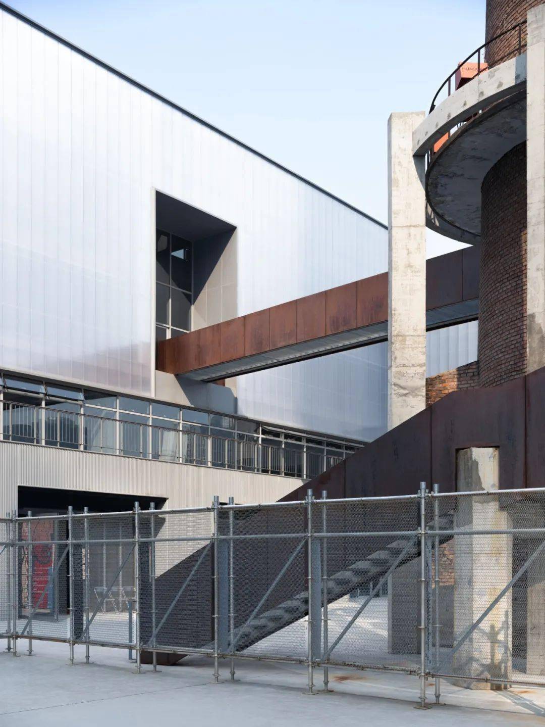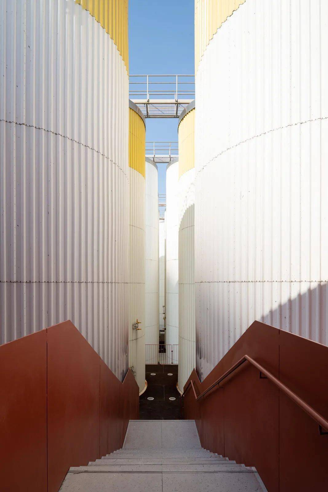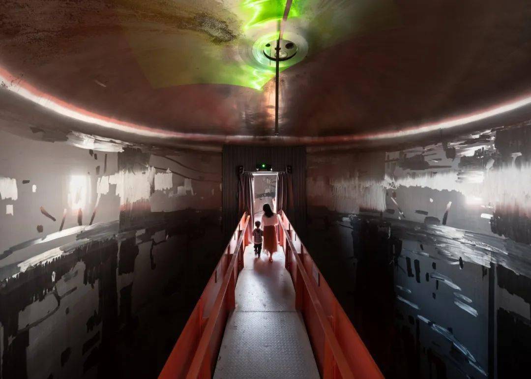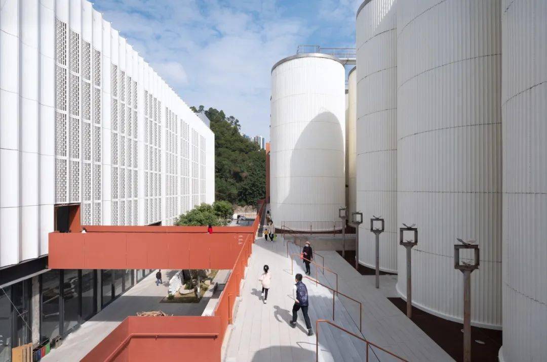 D4 屋面,拔掉中间三个直径7.5米的筒仓罐体,成为户外剧场,自然光从洞口进入室内形成聚光空间,适合展览或表演。切开筒仓进入罐体,加建旋转钢楼梯、电梯等垂直交通,剥去室内瓷砖和吊顶,混凝土天花板上的倒锥形罐体与裸露的混凝土结构还原出建筑空间的工业气场;顶部以连桥穿过罐体形成空中连廊。其中一个拔出的罐体被卧倒在 E 栋屋顶,成为空间装置。