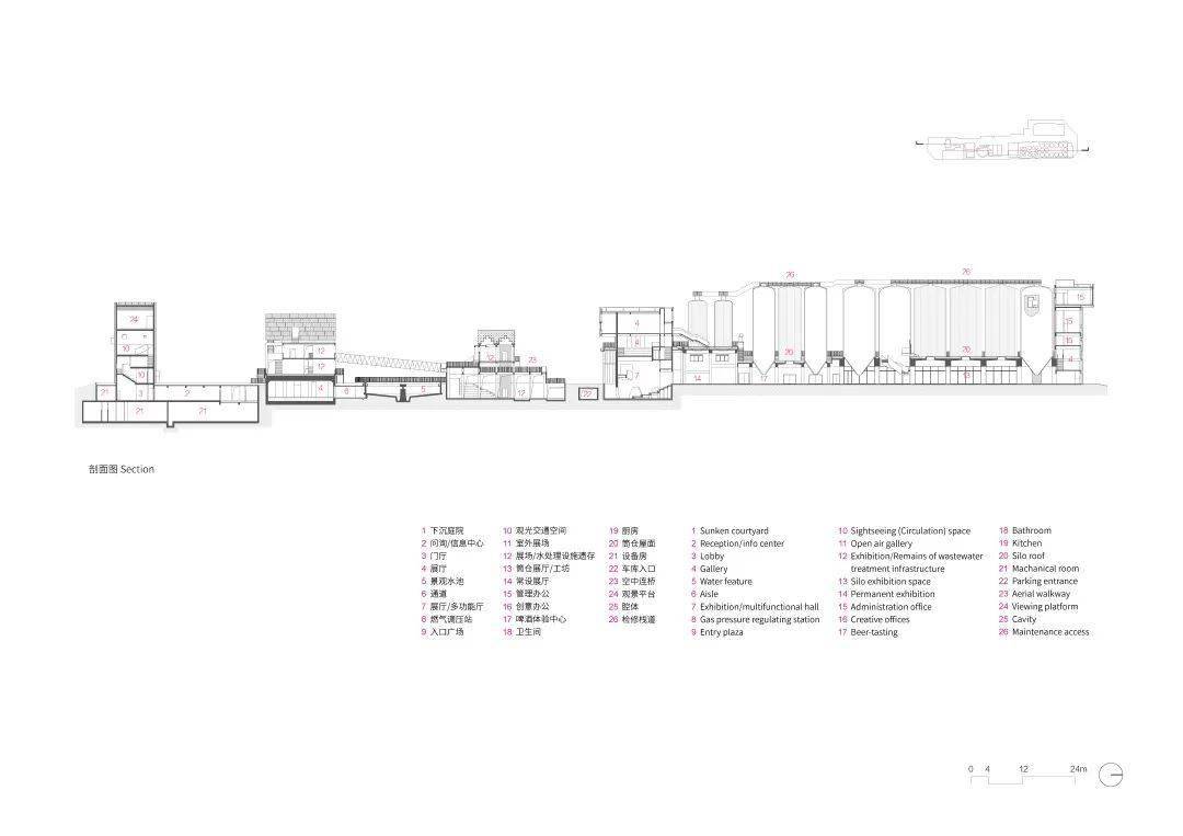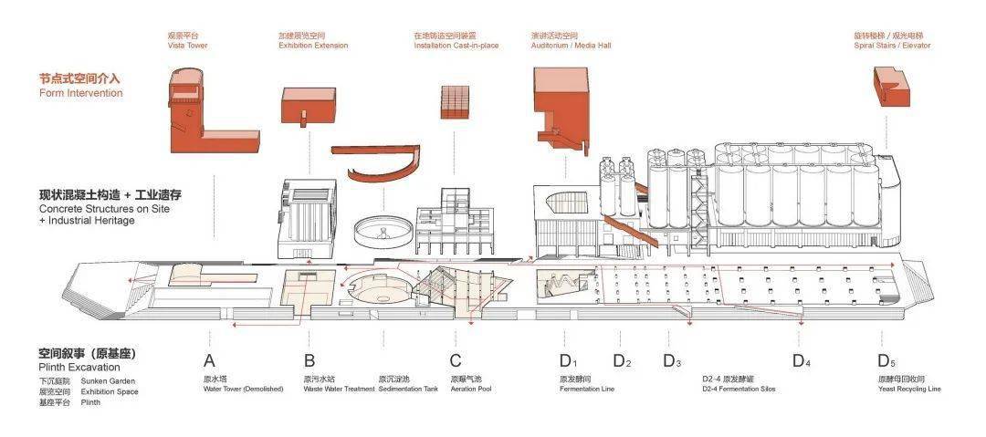 啤酒厂拥有独特的工业建筑空间体验,然而其零散的厂房遗存在场地中无法形成完整的空间序列。都市实践采用整合、插接、介入的改造策略,将场地与西侧路面1.65米,东侧约3米的高差形成的底座转化为空间叙事的基座统合原本散落的体量;以整体的力量与周围大尺度的新城市环境取得平衡。