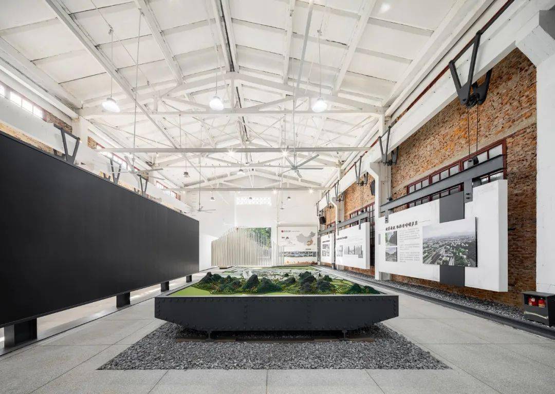 吊装展板的组件设计灵感来源于厂房原有的滑轮设备。铁路中常见的工字型轨道、枕木、碎石、铆钉等元素,反复运用于展墙与沙盘的设计细节中,以老物件的功能承续,呼应场地记忆的衍生更新。