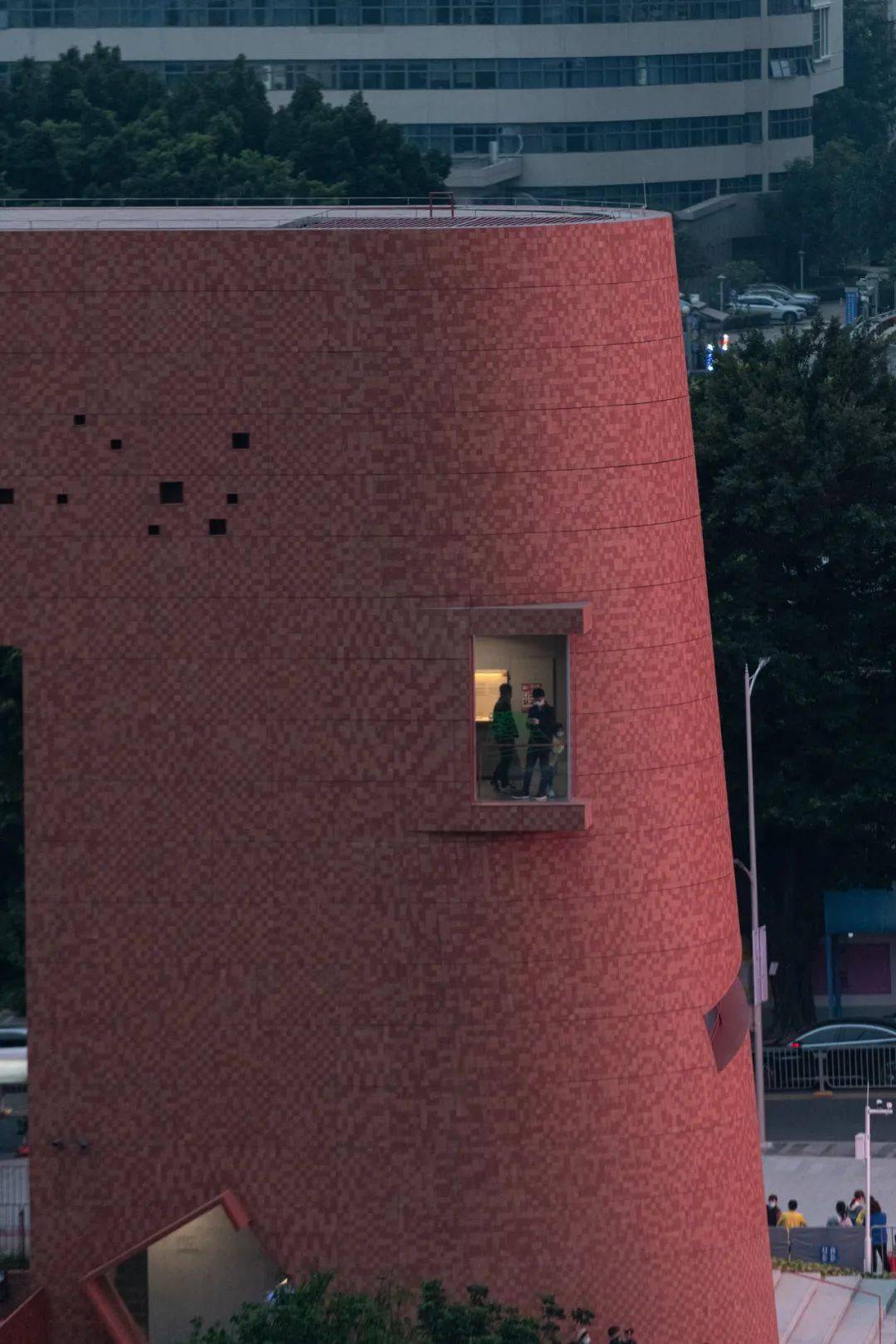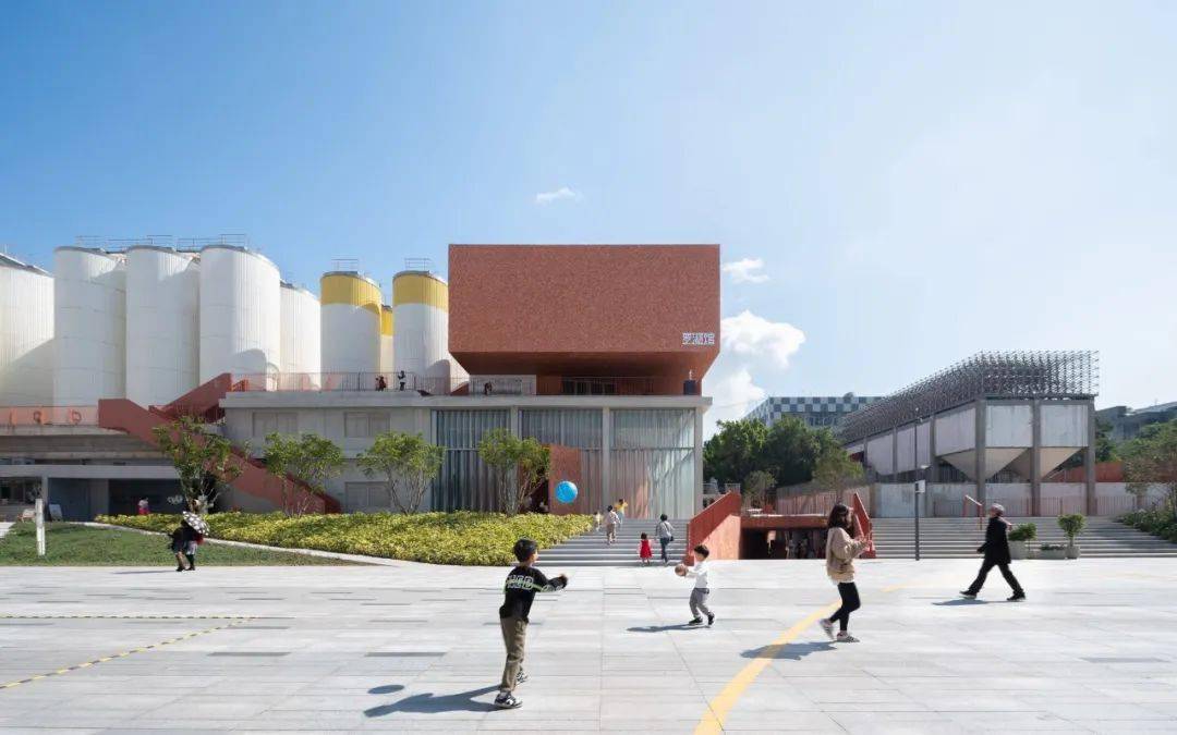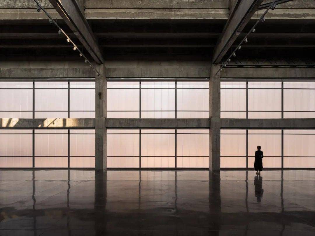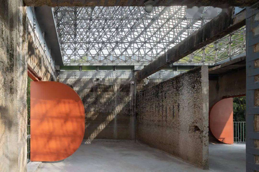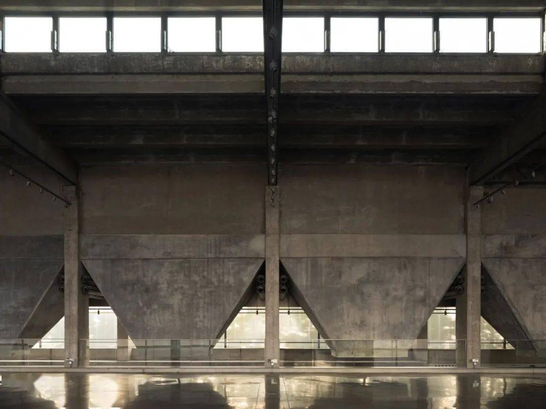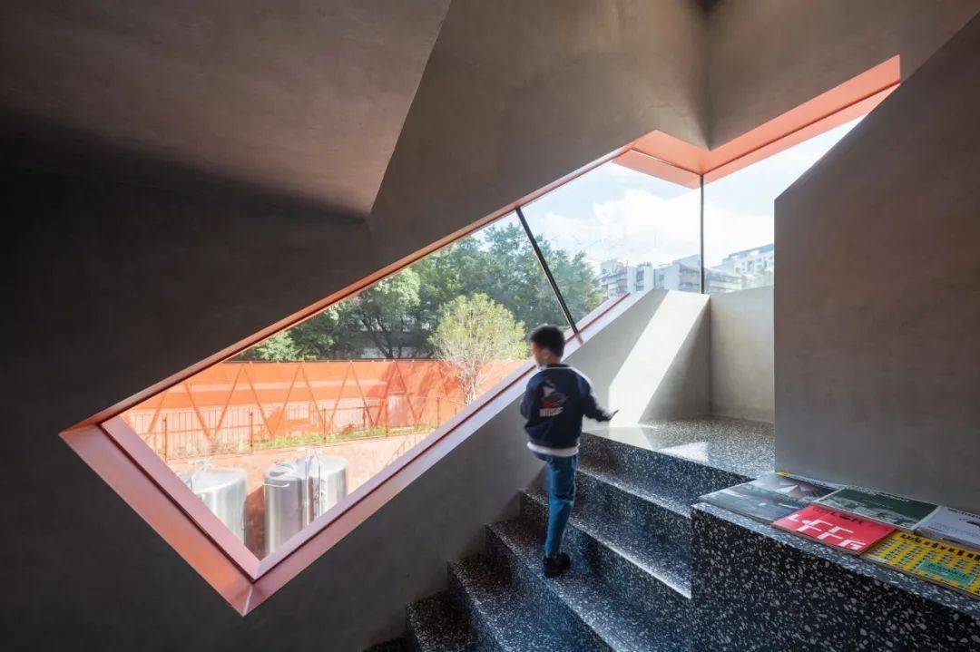 凿开 B 座污水站、C 座曝气池建筑物原密闭的水池空间,削去表面瓷砖,裸露高耸的混凝土结构下方,红色手工砖似火焰蔓延,覆盖台阶与地面。在 B 座顶部加建 300 平方米的钢结构盒子展厅,其泡沫铝板外饰面的金属质感与主体混凝土的厚重完美融合。