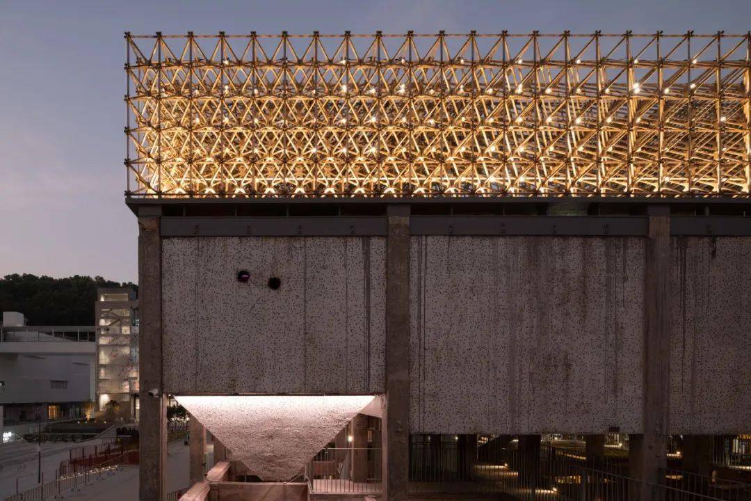 在C座曝气池顶部,金属铸铝杆件的拼接加以迷幻的灯光造就出一个金色构筑物,似啤酒泡泡在悦动。