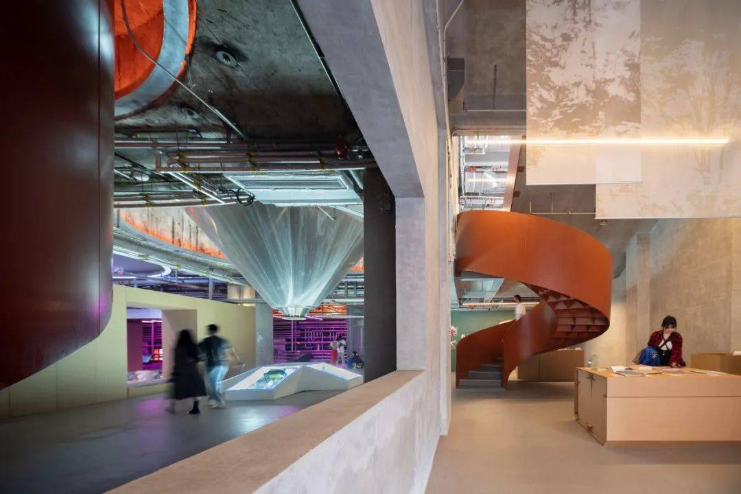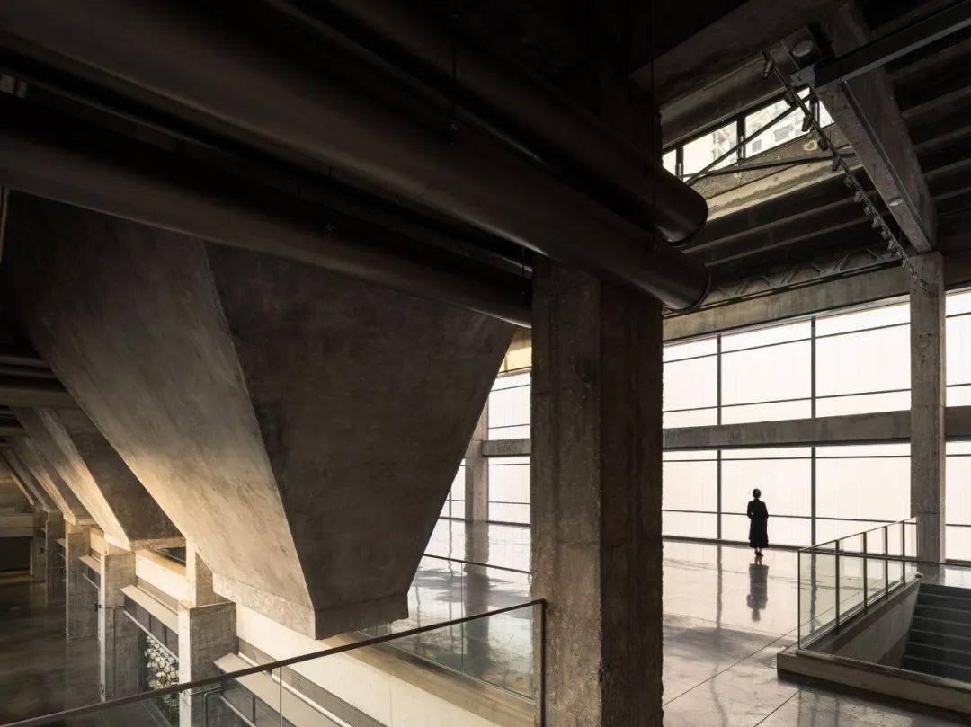 功能的转变还带走了老的生产设施,带来了新的建筑设备。部分较为杂乱机电设备经过优化隐藏,尽量减少了对原有空间的干扰。另一些具有表现性的管线选择了明露,比如主展厅的空调系统利用料斗和柱子之间的三角空隙布置了风管,配合 24 个球形喷口进行送风。精致的不锈钢风管,与原本粗拙的混凝土并置在一起,也相互映衬了各自的时代。
