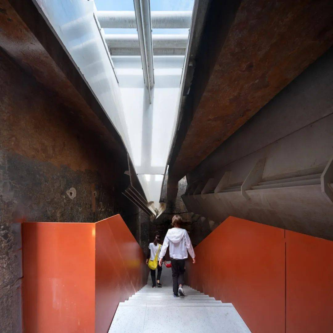 从物流到人流的功能转变,增加了组织展览流线和扩大消防疏散宽度的新要求。为此,我们在锅炉房的前广场上增加了一条直通三层主展厅的天桥。这座天桥拾阶转过门前的喷涌过岁月的大烟囱,在回应功能需求的同时,也把新的时间绕在了那段旧的时间之上。