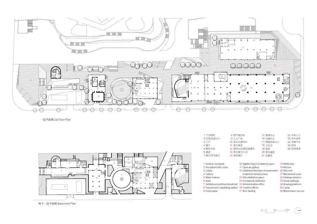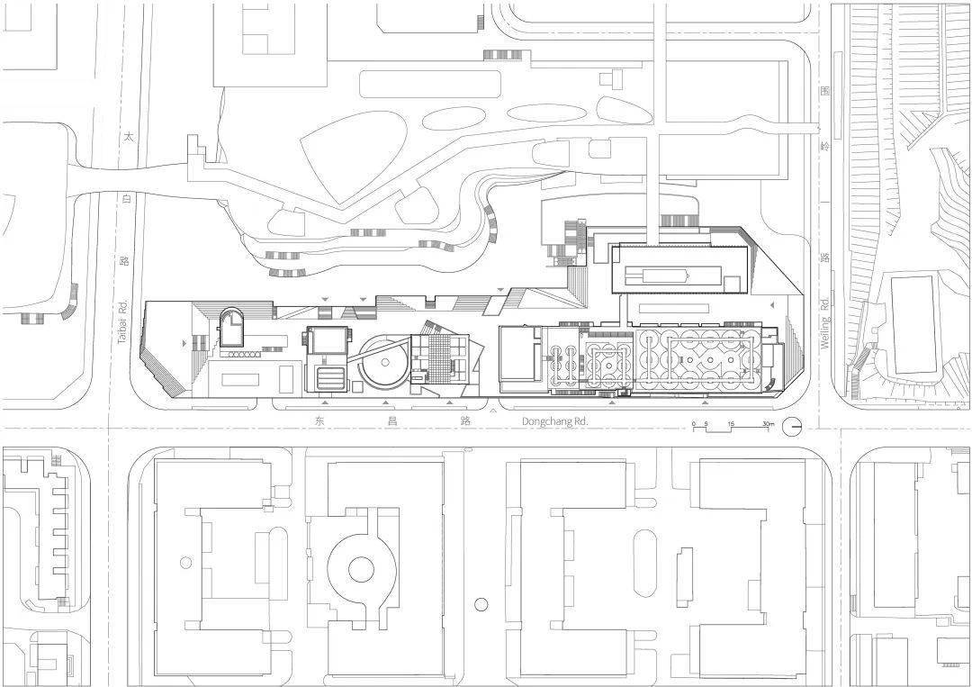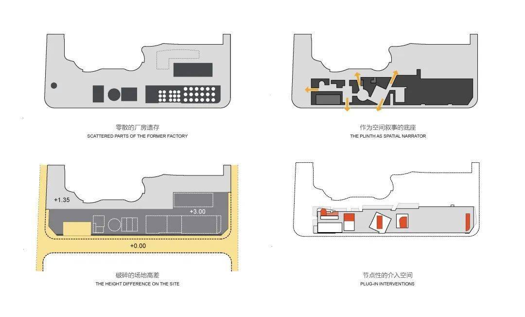 “基座”重新组织交通成为文化空间及展示工业建筑的舞台。基座顶部为室外展区串联各建筑,内部结合现状地下空间开挖一系列下沉庭院、通道与活动空间,创造出一条空间叙事主线。场地东侧的封闭立面打开数个空间形态不一的出入口, 266 米长的街道被激活。