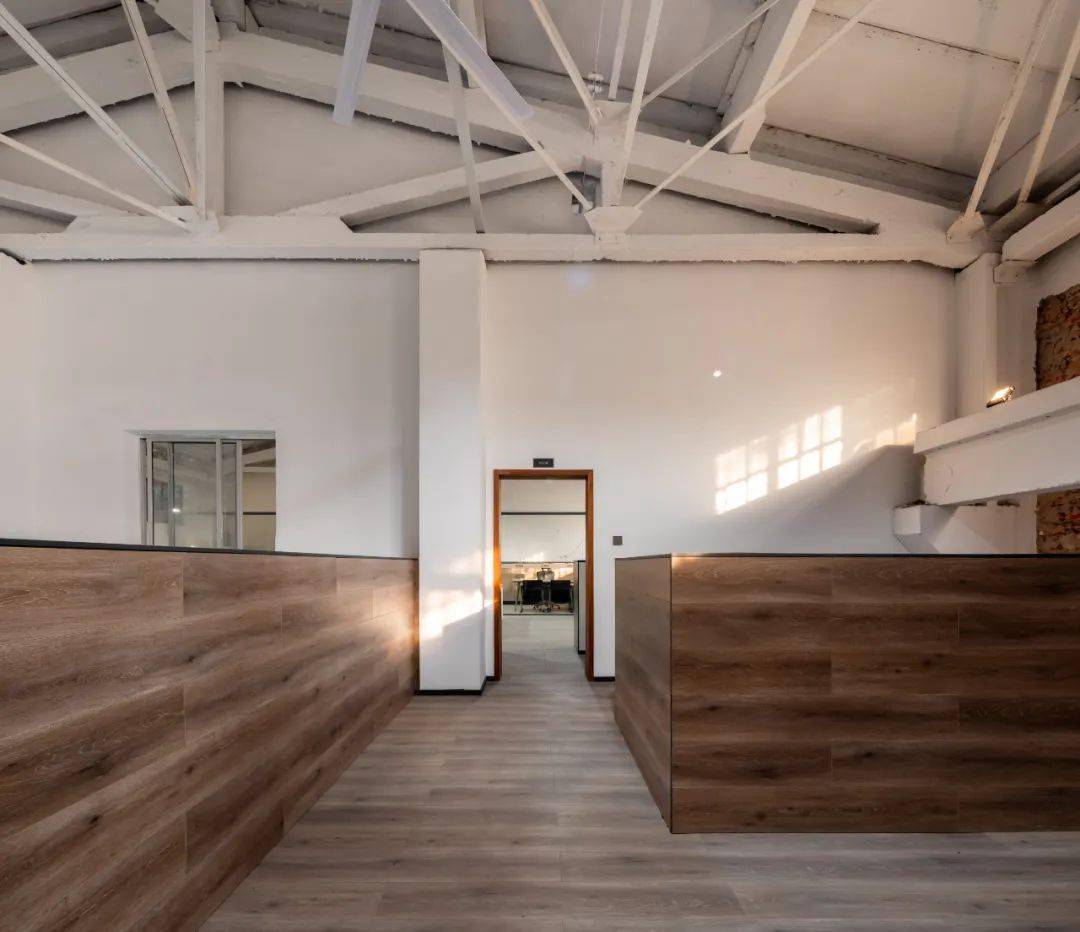 空间端侧运用厂房建筑的层高优势搭建VR体验室,上方平台设置与办公空间相接的开放式茶座,兼具开阔视野与静谧氛围。