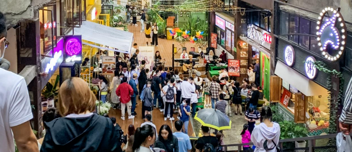 街区围绕“一步一景”,重点突出“夜元素”,新增五彩灯饰及系列城市小品,并通过对白长椅、“仓之秘境”“艺术空间”“有料”涂鸦墙等系列艺术装置及趣味打卡点的设置,多角度、多形式地实现现代人的桃源构想。同时,这里还会不定期举办各种创意集市和主题活动。比如,万圣节主题集市,犹如曼谷夜市市集既视感,有20多个小铺,包含文创类、美食类、服饰类,每个小铺都很符合万圣节主题、复古感,还有rapper表演。