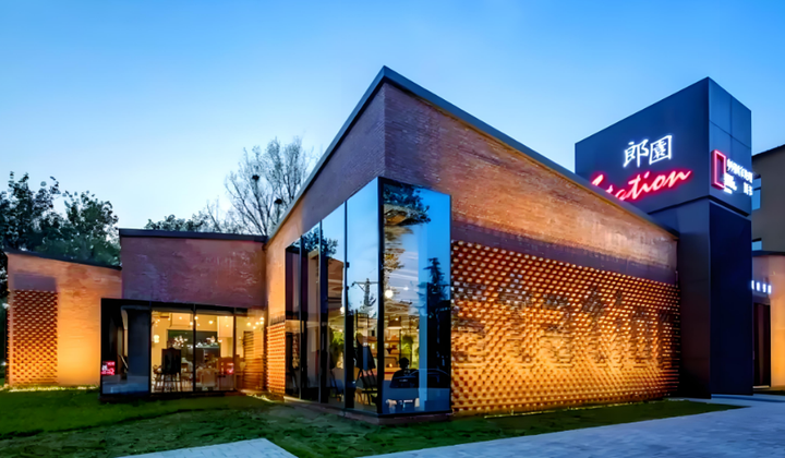 在建筑上,立面采用了红砖、清水混凝土、钢玻等建筑元素,展现出独特的工业风格与现代时尚的融合。整个项目主要由三栋建筑组成,A栋是主题型集中式商业,C栋是艺术商业定制空间,B栋是立体式停车楼。