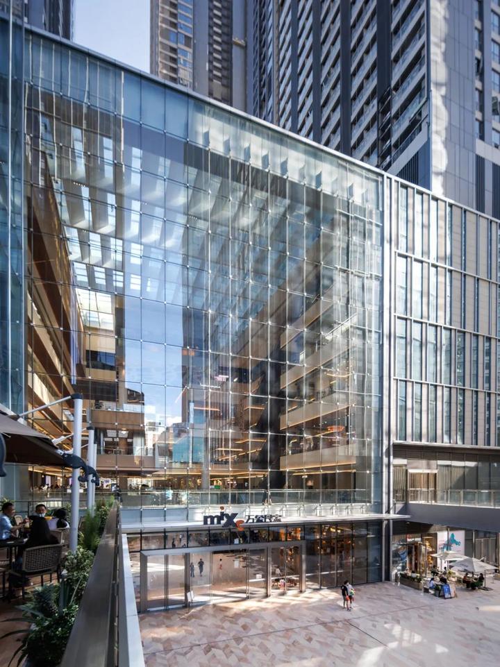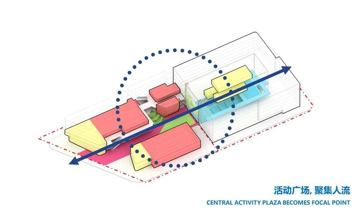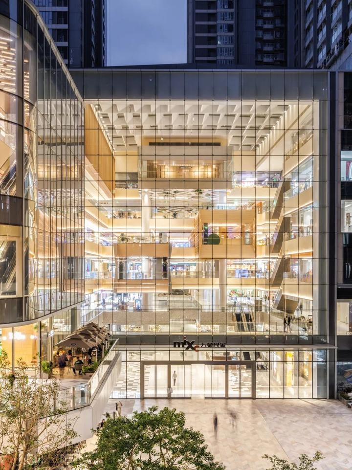 万象食家采用街区+Mall的组合方式,在户外区域结合漫步式街区,并设置多处架空、挑廊、露台空间,实现商场与街区的交互,更具休闲步行街的氛围;室内中庭重叠交错的3个悬浮盒子十分引人注目,带来了奇特的视觉冲击力和独特的中庭体验。其设计灵感源自集装箱快餐车;商场主入口空间处的雕塑型顶篷也是万象食家空间设计的一大亮点。在镜面不锈钢材质的反射下,天空、车辆、行人和周围的大厦变得抽象而多变,视觉想象力在此触手可及(福州万象城也有1个悬浮盒子)。