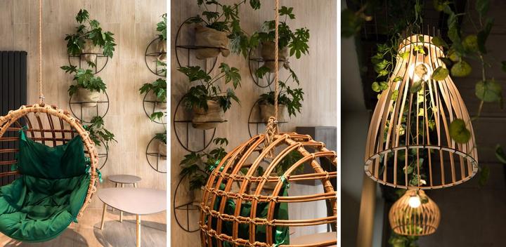 木头设计受到日本传统器具的启发,比如悬挂在桌子上方的装饰灯就类似于制作抹茶的搅拌器。设计师在内部提供了许多在钢结构和类似的天花板网板上的架子,从而可以为绿色植物们创造尽可能多的空间。