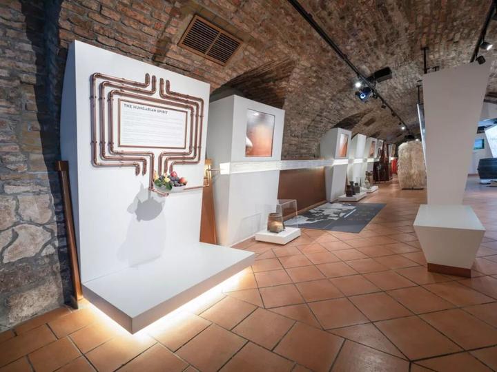 在博物馆中,除了整个场地的统一设计之外,还出现了另一个重要元素:时间轴。一个铜管从水果盘启动入口,贯穿在整个空间中运行。沿着这个管子,我们可以浏览蒸馏的历史和palinka的制造过程。