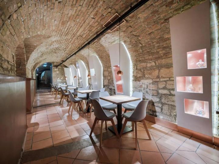 该场馆包括三个主要功能区域(酒吧,互动展览,商店),它们通过统一的品牌和室内设计风格相连。用旧砖覆盖的旧酒窖的墙壁与展览设施和家具的纯白色简约形成鲜明对比,灯光进一步增强了对比。