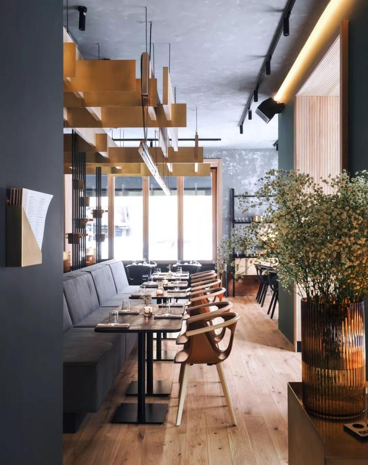 THE SIZZLE 餐厅2019年开业,该项目的设计目标是创造简约但又舒适现代的室内装饰。木质和黄铜制成的富有表现力的天花板是大厅的主要特征。天然材料的使用反映了餐厅的概念——具有独特特色的简单和传统的欧洲美食。