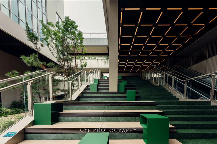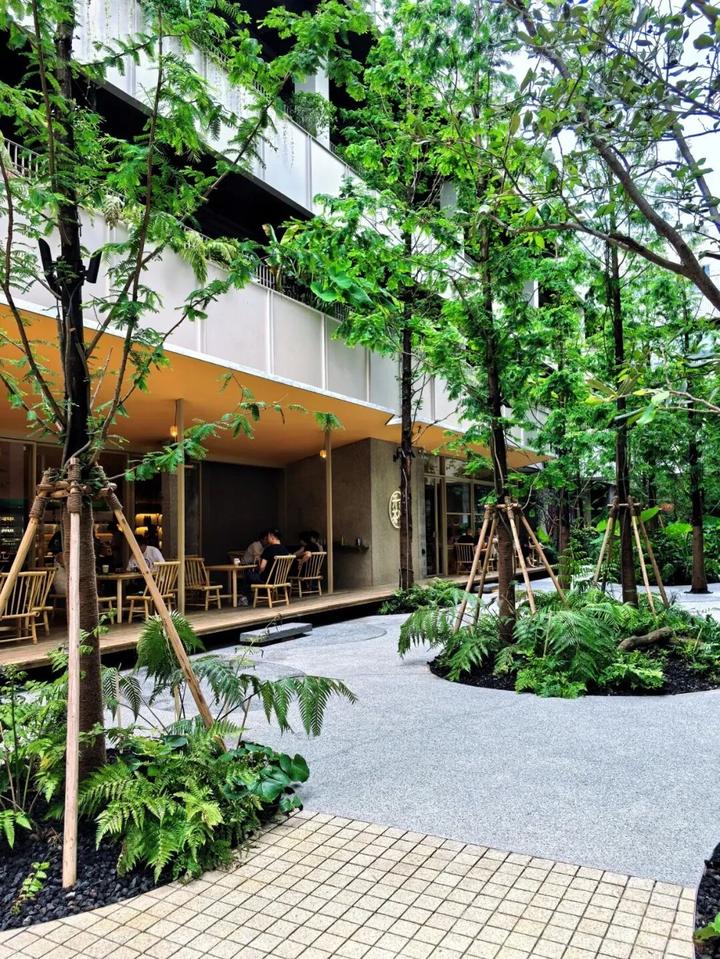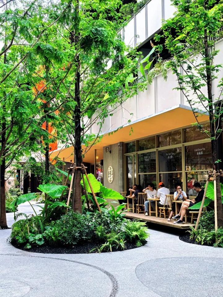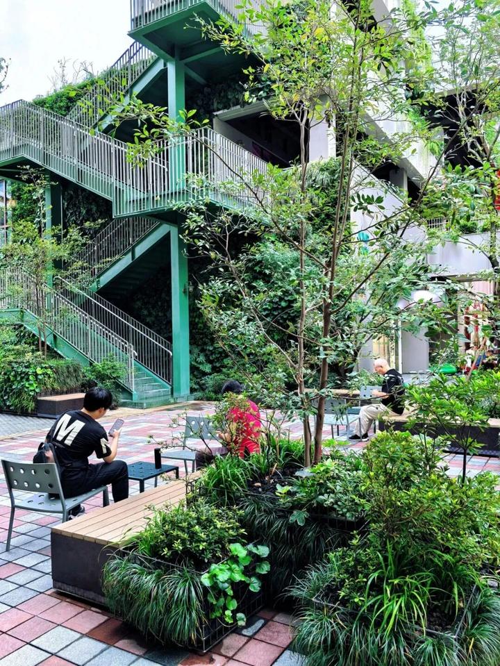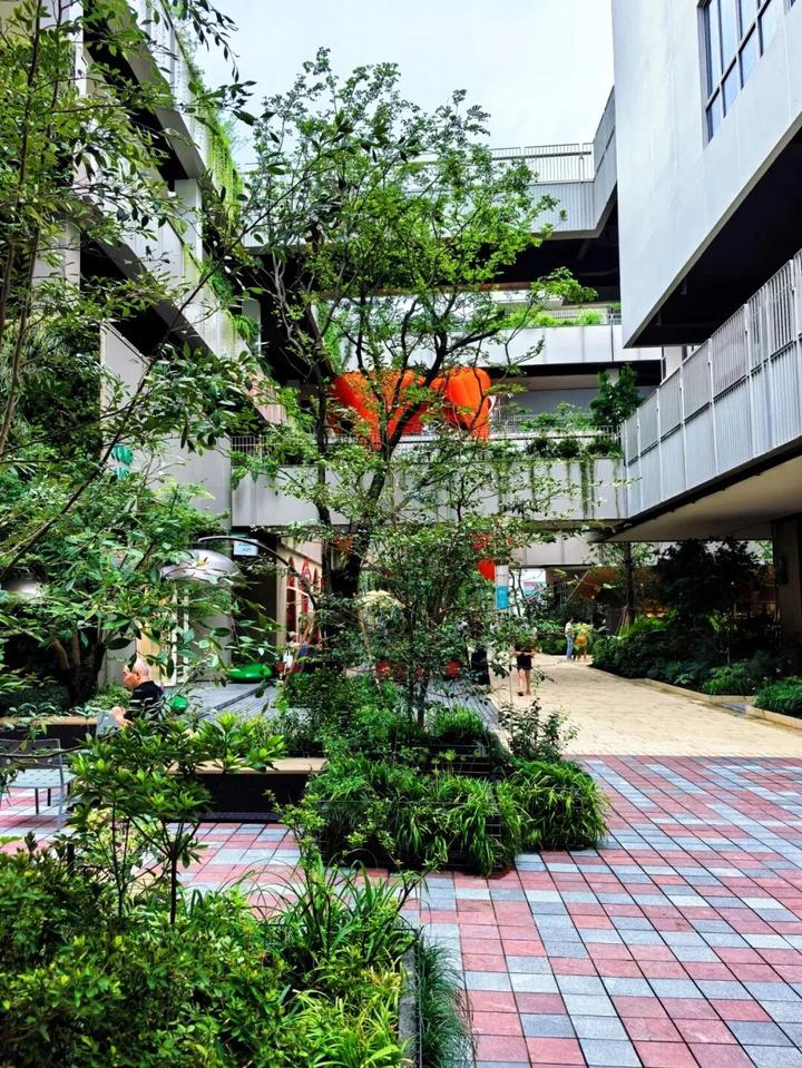 项目80%公共空间被绿植覆盖,大量的蕨类植物、连廊间垂落的绿植,打造了一座充满生机与活力的“城市丛林”。再加上无边界的“聚落”打开方式,瞬间拉近了街区里“人和场”的关系。