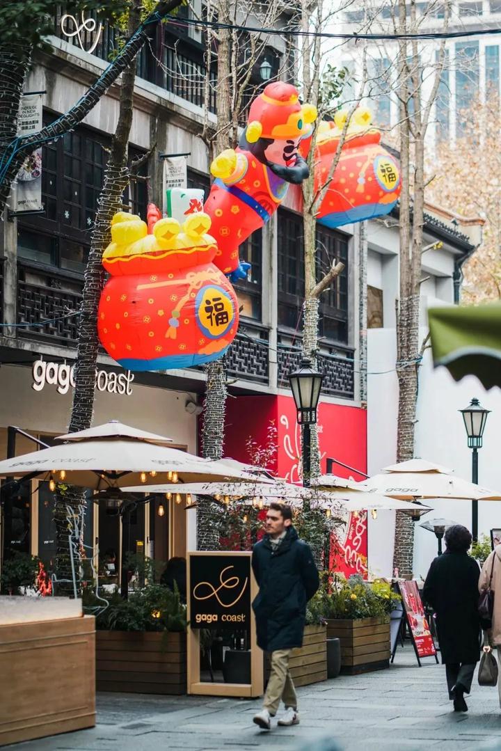 而且每到节假日,新天地的店铺美陈更是卷出新高度,无论是圣诞季的冰雪童话镇还是春节的“国潮灯会”,项目与品牌一起在公共空间筹备各种快闪店,共同做街区氛围,不断地把年轻人喜欢的品牌和体验带到大家身边, 好看的商业,自然更容易吸引客流。