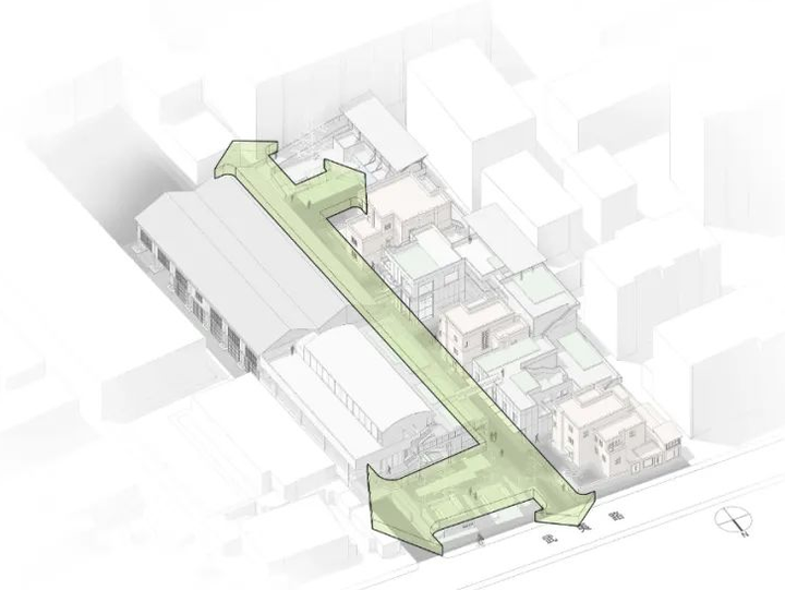 在设计过程中,在厘清花园洋房与新建体量之间建筑边界的同时,利用建筑间的狭缝、灰空间等串联起一条次级路径与公共通道连通,空间豁然开朗,可供商户摆放室外外摆。地块东侧沿南北向布置的菜场为市民提供了一条公共开放的室内路径,与公共通道和小径共同形成了地块内三条南北向的公共动线。三者之间由数条东西向的联络道拉结成鱼骨状的慢行网络。