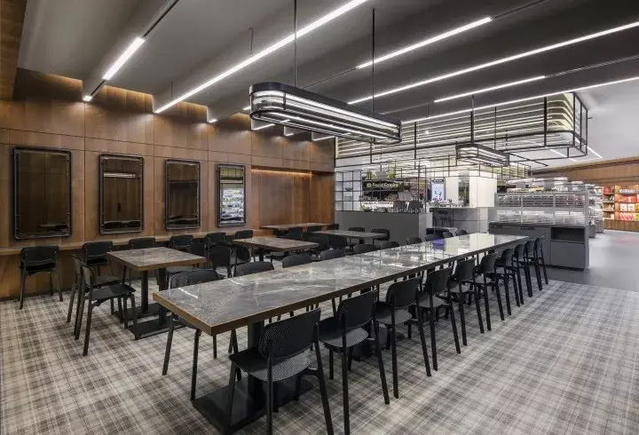 为了让顾客能自然看到和购买产品,空间对动线进行了规划,熟食现做食材的区域被安置于空间的中间,形成一种回路式路线,新鲜的食材均集中于中间的区域,便于选购。同时空间中提供了用餐区域,为了避免购物者和用餐者互不影响到,所以用餐区单独设计到另外一个区域。