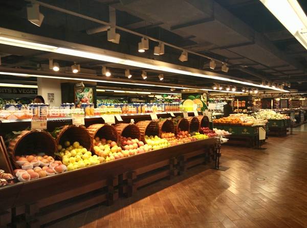 再次,高级超市的灯光设计较为讲究,尤其是生鲜区,以微黄的柔和灯光为主。另外,整个卖场的货架以深绿色为主色调,每一个展台都铺着与货物颜色相协调的台布,这样,灯光与食品和货架的颜色相融合,看上去非常舒服。