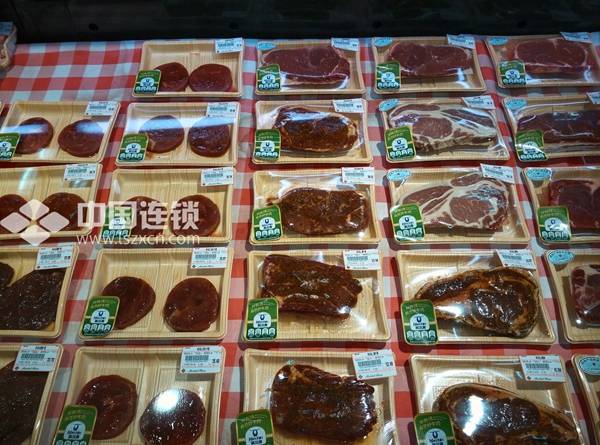 北京华联BHG精品超市出售的多为小包装商品,像肉类,两三块做成一个独立包装,有机水果蔬菜也是提前用保鲜膜包装好,标明重量及价格,整齐的摆放在保鲜柜里。避免了排队称重的麻烦。