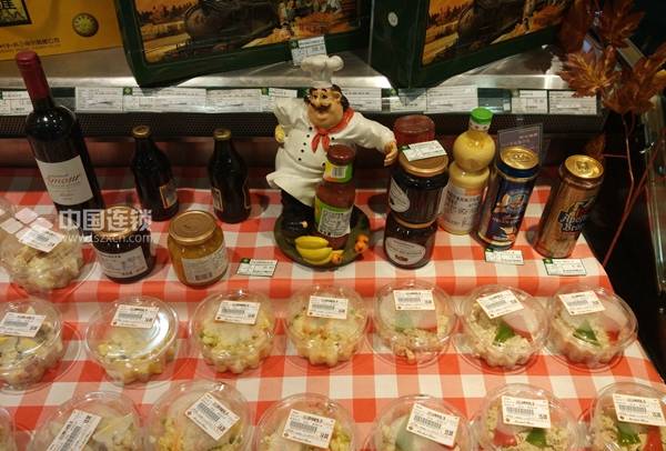 创意美食厨房是BHG高级超市里极具特色的熟食专区,提供精致卫生丰富的菜品和主食,所有食物提前打包,标明重量及价格,错落有致的摆放在展示柜里。另外,熟食区的装饰及设计风格具有家的味道,展示架选择红白条格的台布,看上去很温馨。美食的诱惑与温馨的情调相结合,是一种美好的享受。