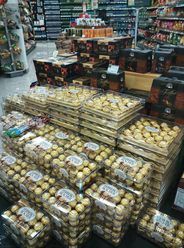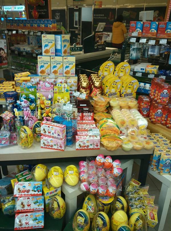 另外,收银台的后侧摆有一排展台,展台2到3层不等,展台上陈列着饮料、红酒、巧克力等商品。在收银台旁边专门有一个展台放着各种儿童食品和形状各异的小玩具,特别吸引小朋友的眼球。